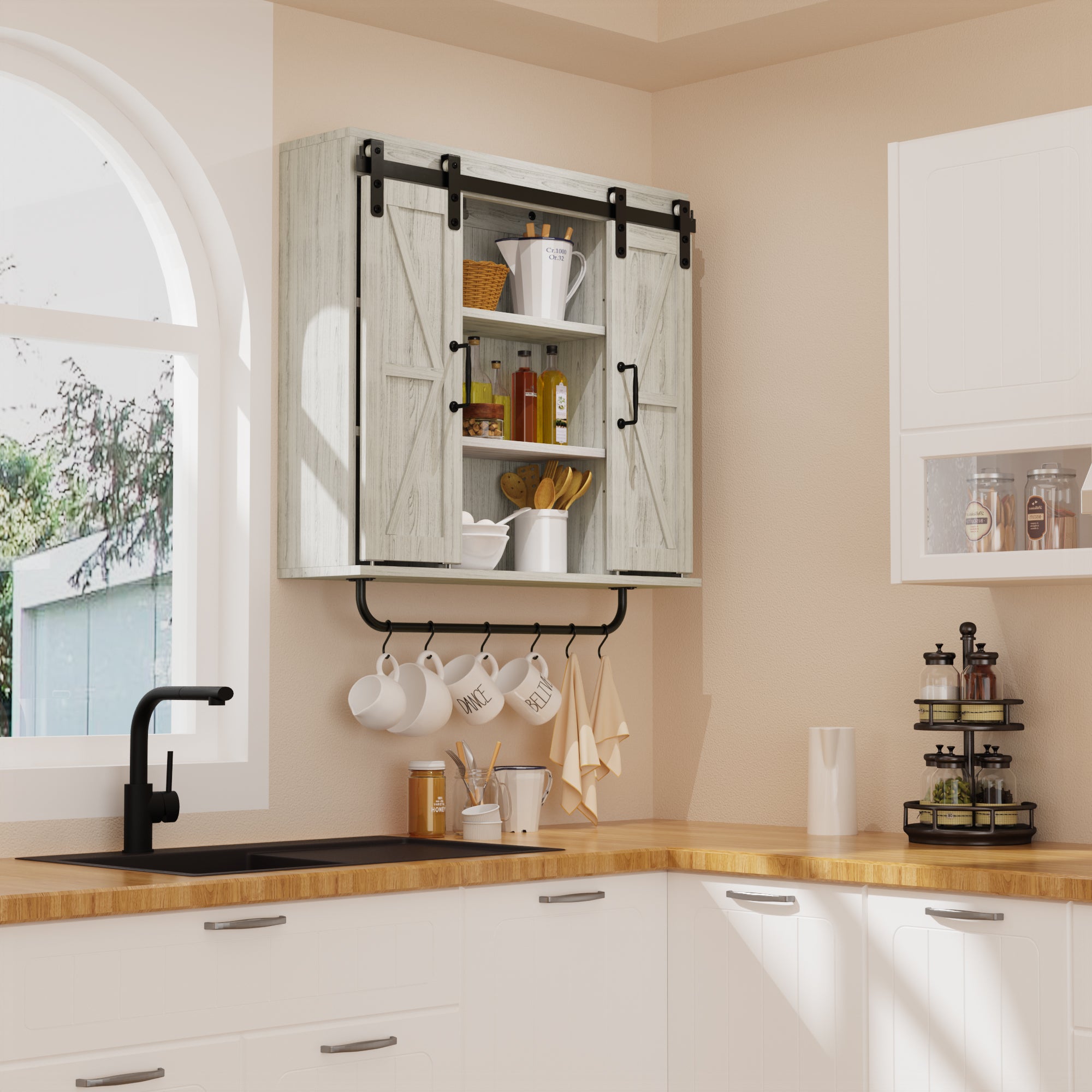 Enhance your home with this Rustic Wood Wall Storage Cabinet featuring two sliding barn doors and a stylish 3-tier design. Perfect for adding a touch of farmhouse charm to your kitchen, dining room, bathroom, or living room, this vintage gray cabinet provides ample storage space while elevating your home decor. Crafted with durable wood, it offers a practical and aesthetic solution for organizing essentials, from towels and dishes to décor pieces. Bring rustic elegance to any room with this versatile and functional cabinet, ideal for both storage and style.