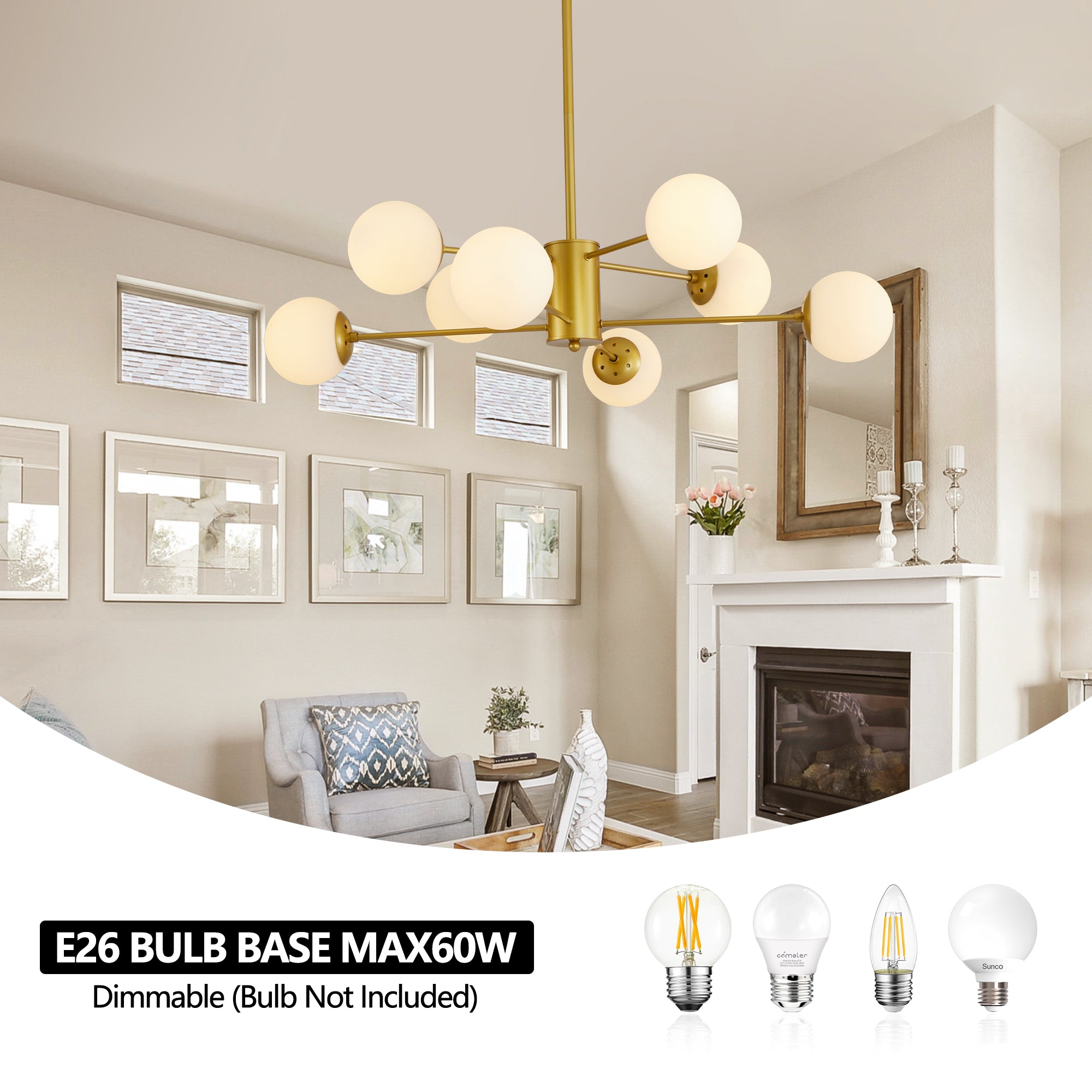 35' Modern 8-Light Gold Chandelier with White Glass Globe Shades, Mid-Century Branching Design, Elegant Ceiling Light Fixture for Dining Room, Living Room, or Bedroom (No Bulbs)