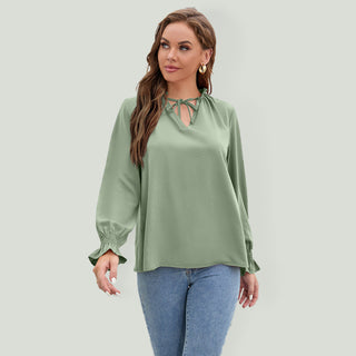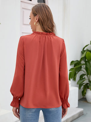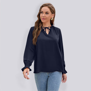 Women? Solid Color Ruffled Tie V Neck Long Sleeves Blouse