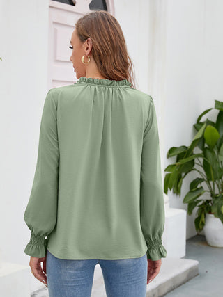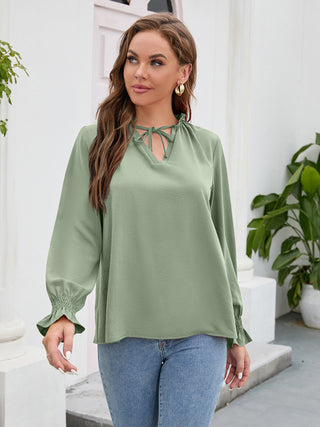 Perfectly polished with a ruffled tie neckline and ruffled cuffs, this long-sleeve top easily dresses up any outfit, making it an ideal option for so many occasions.