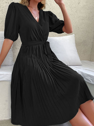 Women's solid color tie v-neck pleated dress with fashionable style and soft and comfortable fabric. It can be worn for daily, dating, going out, vacation and so on. Washing method can be machine wash or hand wash. Fabric resists wrinkling and pilling. The size is measured by hand, and it is normal for there to be an error of 1-3cm.