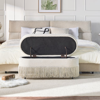 Oval Upholstered Storage Ottoman with Fringe Trim & Lift-Top Lid - 39'L x 16'W x 17'H, Multi-Functional Footrest & Hidden Storage for Living Room or Bedroom - Beige Fabric with Metal Frame