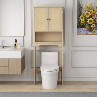 Over The Toilet Storage Cabinet, Bathroom Shelves Over Toilet with 2 Rattan Doors&Adjustable Shelves&Open Storage Shelf-Natural Wood