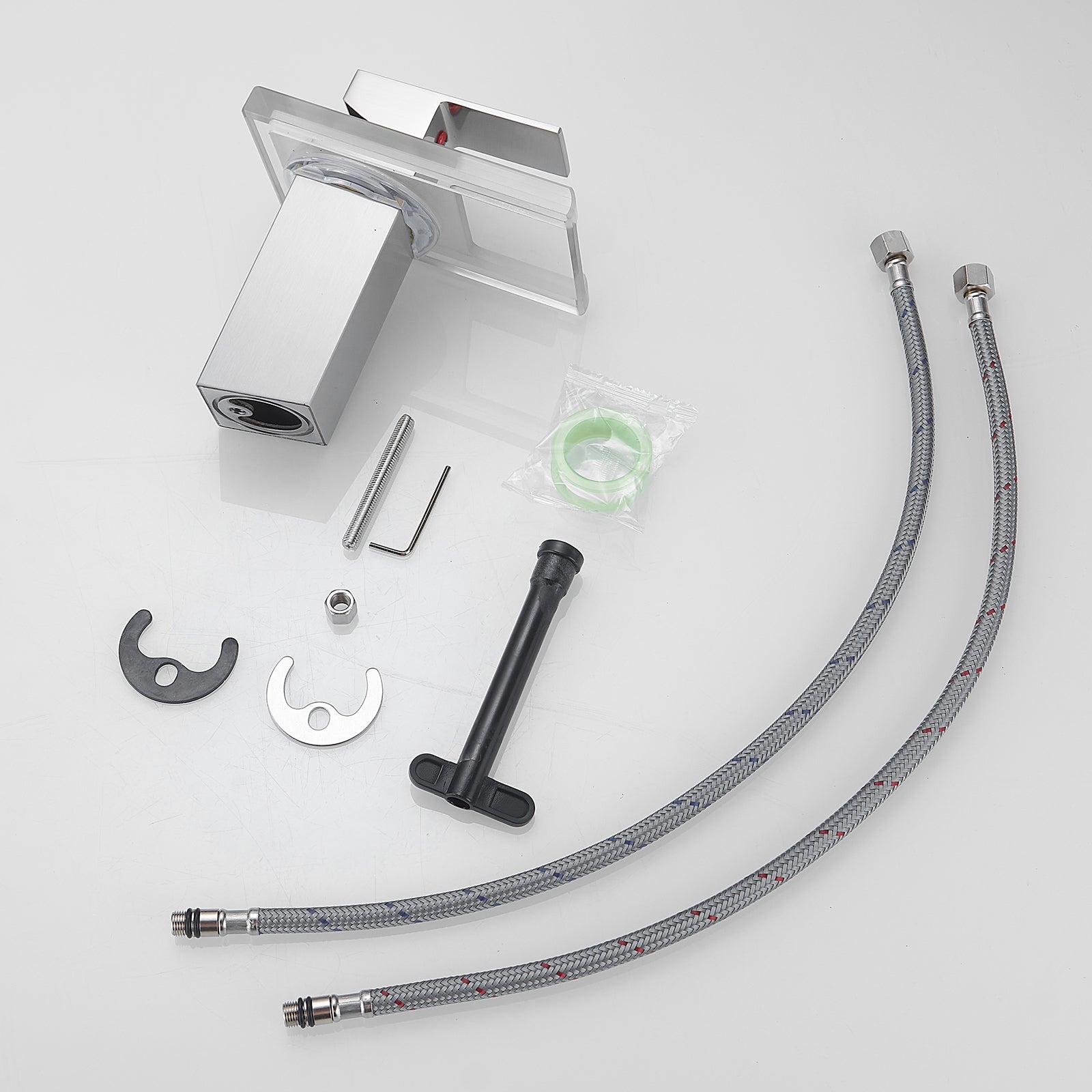 Waterfall spout and built-in LED,changes its color by detecting the water temperature: ①Blue - cold water(0~30°C); ②Green - warm water(31~42°C), ③Red - hot water(43~52°C) ④ Extremely hot water-Red warning light flashes on and off to avoid scalding Single hole bathroom sink faucet is easy to install with a 6" deck for 1 or 3 hole sink installation, standard 2 supply lines.One lever handle makes the temperature and flow rates change in an effortless way Led lights powered by 4pcs AA batteries (batteries not included)