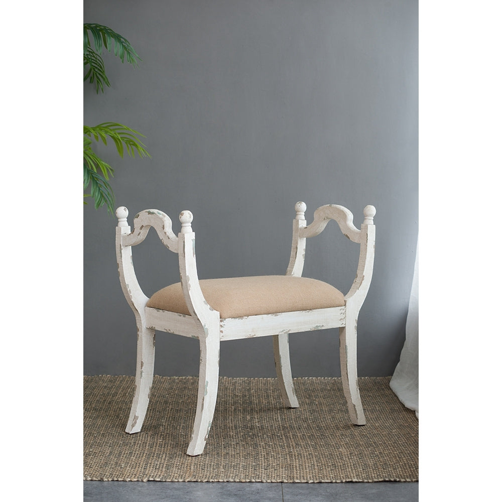 Add an element of vintage charm to your foyer, living room or bedroom with the Harlow bench. It can also serve as a decorative vanity chair. Featuring a slightly curved frame and rustic burlap upholstery, it is finished with white paint and distressed details.