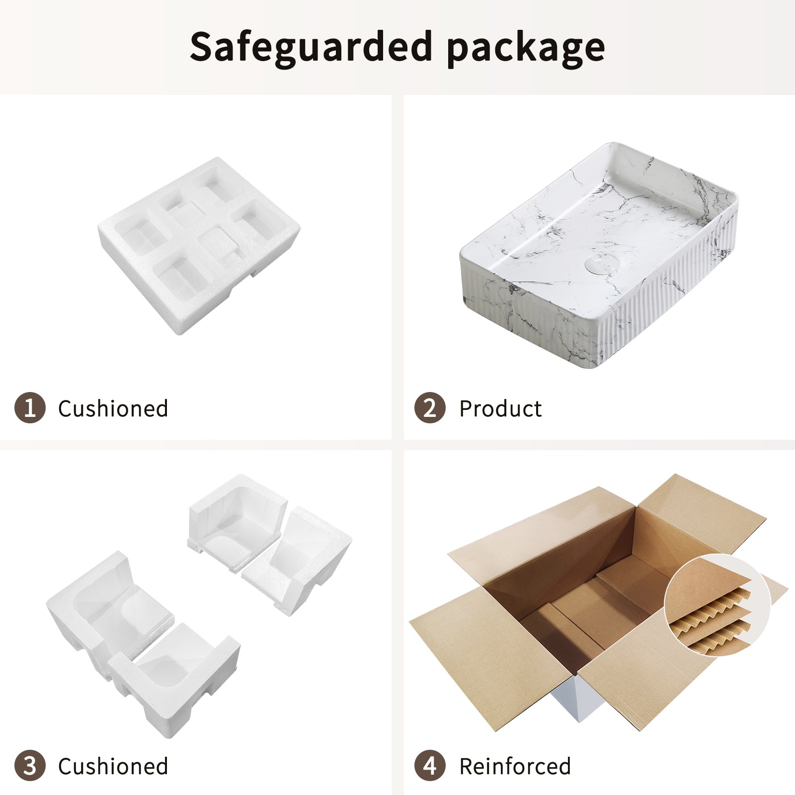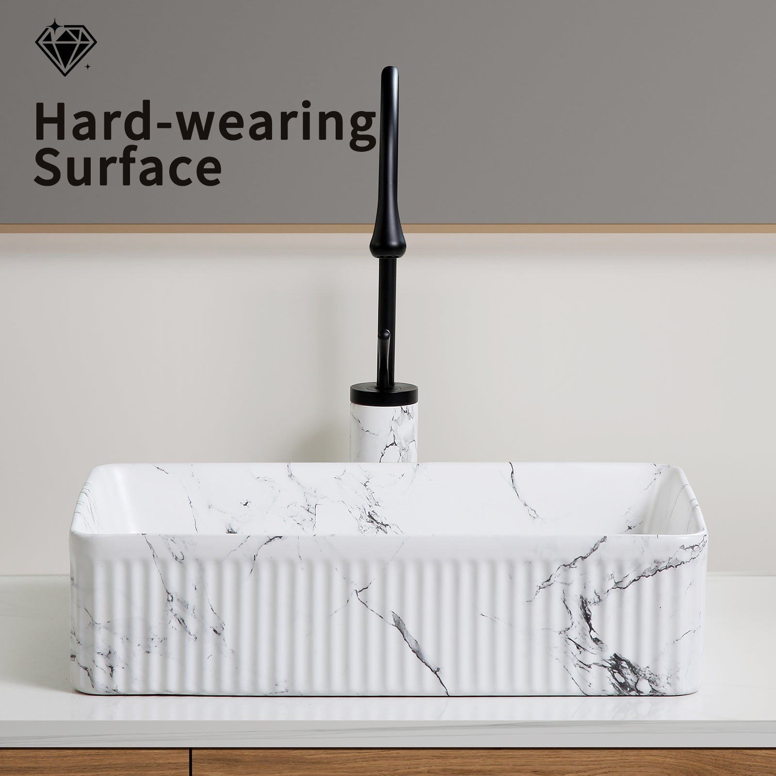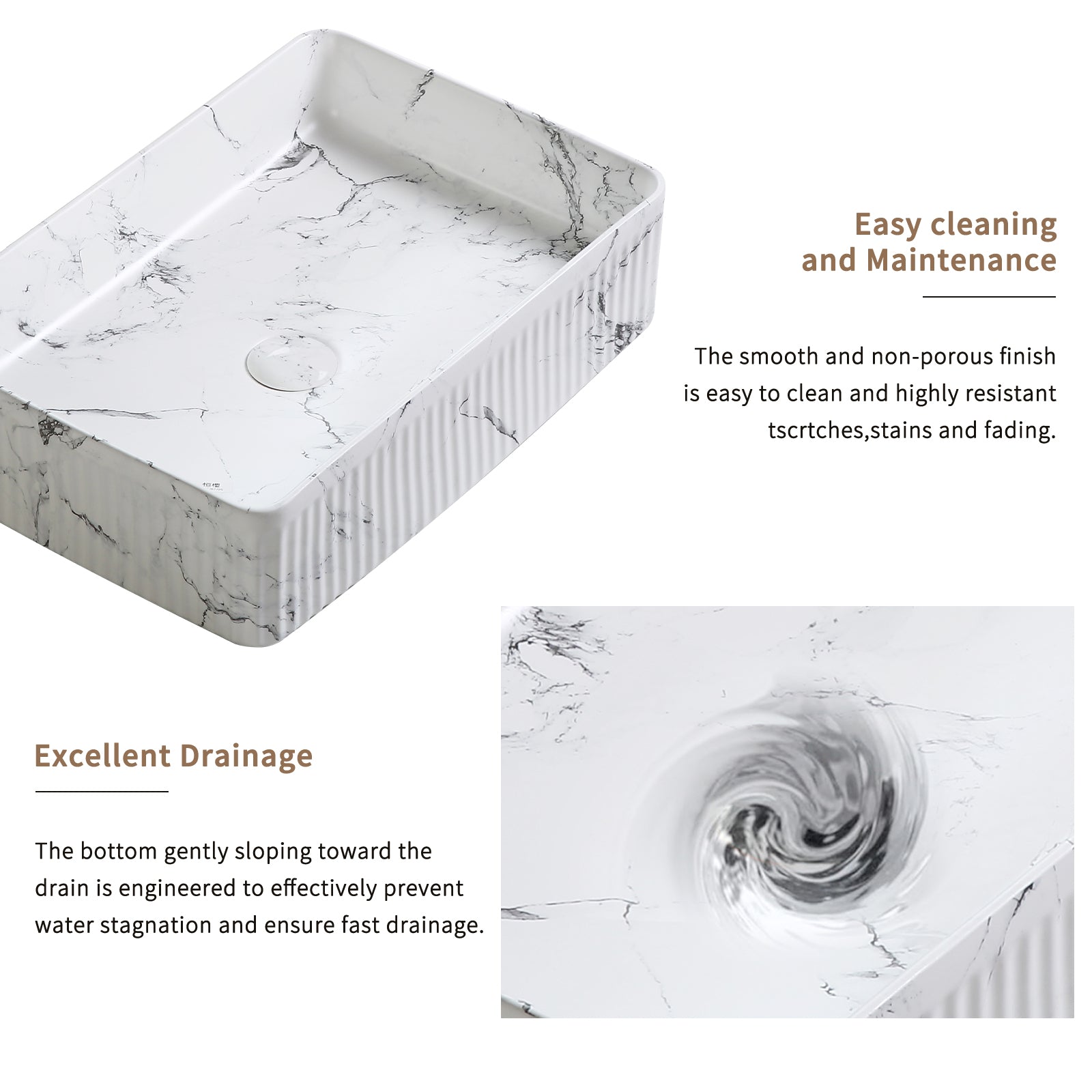 - 【Maple Ceramic Sink】sink size: 19.69 ' Length、13.39' Width 、5.12' Height; Faucet and drain are included,The ceramic basin is fired at temperatures above 1280°C, resulting in a smooth, bubble-free surface that resists dirt. Paired with a uniquely designed marble-pattern faucet, it ensures even water flow with an aerator for a gentle stream. Together, they create a stylish and harmonious look