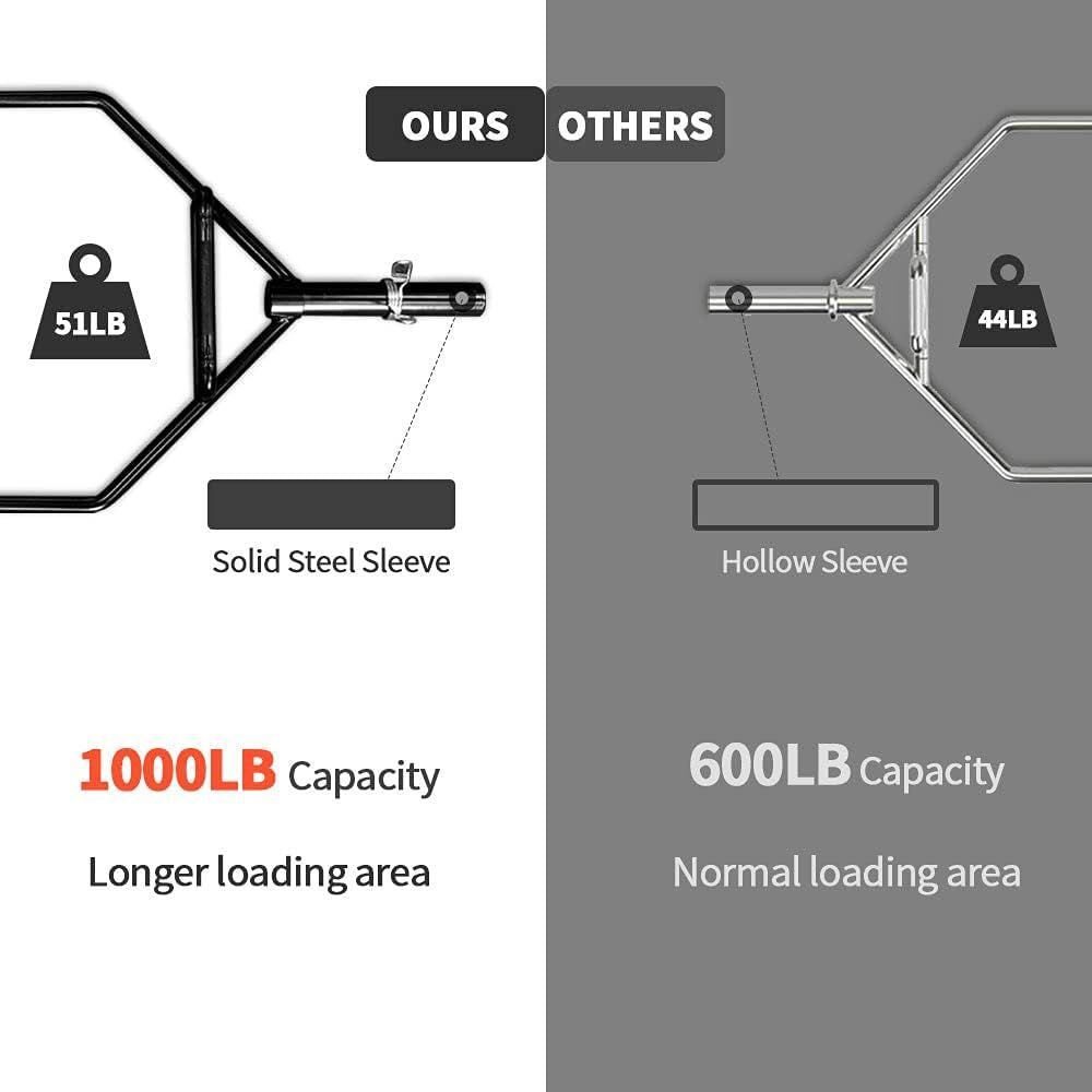 • The hex bar has an overall length of 56”. The handles have a distance of 23.6' between them. Each solid steel sleeve will have a loadable length of 10'. The bar itself weighs about 51 lbs and can support a weight capacity of 1000 lbs. Made to fit 2-inch Olympic plates.