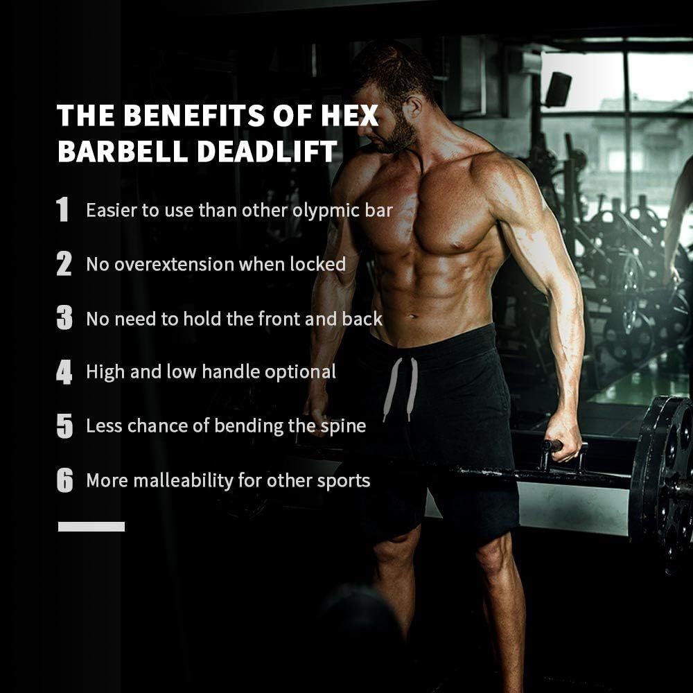 • Hex bar’s unique shape helps keep the weight closer to the lifter's center of gravity and allows the lifter to remain more upright during the movement, which could decrease risk of injury to the low back and make moves like deadlifts, shoulder presses, and upright rows more comfortable.