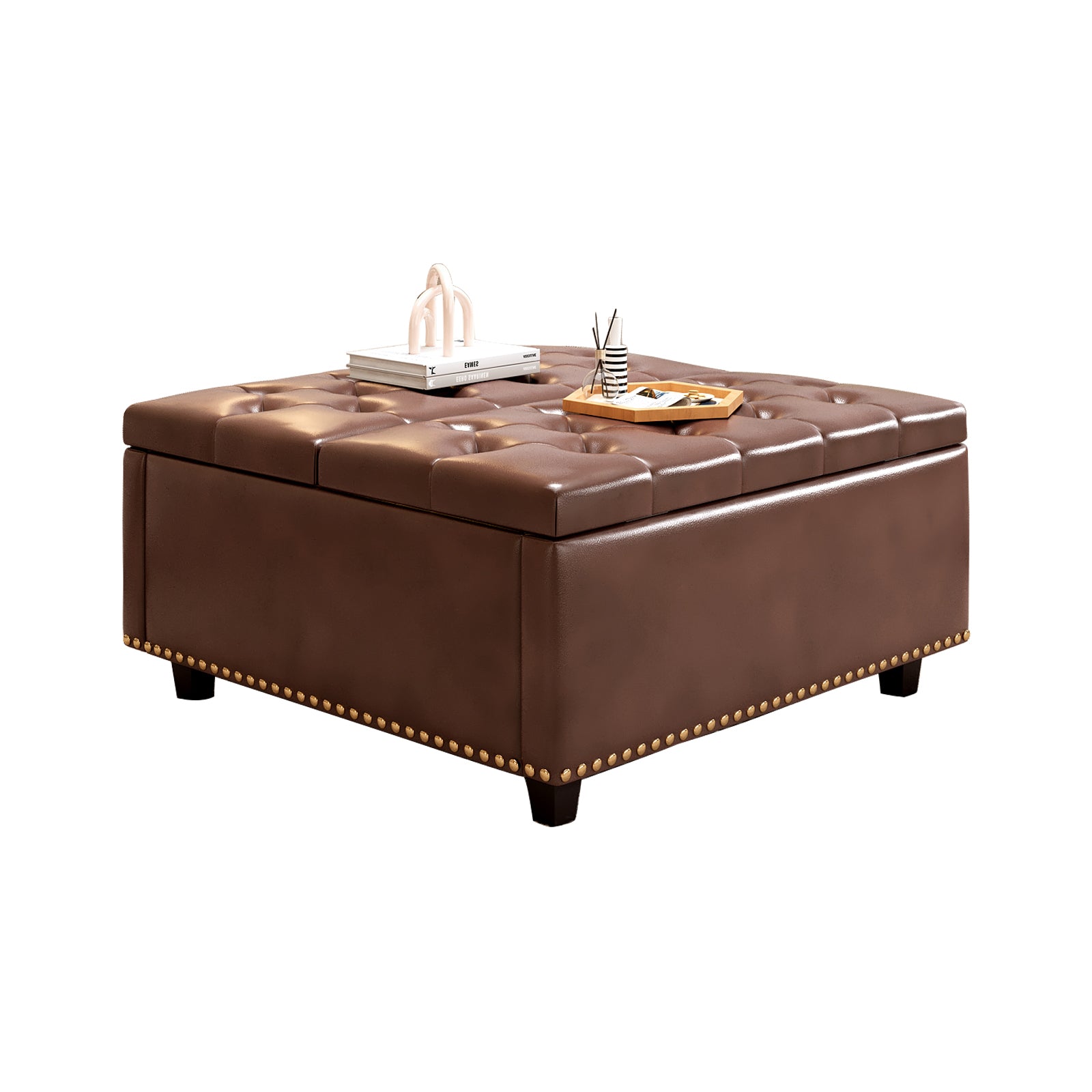 Discover the ultimate multi-functional piece for your living room with this large square storage stool. This elegant Mid-century modern footstool combines a classic aesthetic with smart, hidden storage. The durable brown PU leather is accented with a tasteful nailhead inlay, while the two convenient storage doors provide ample space to keep blankets, pillows, and magazines out of sight. Use it as a comfortable footrest, extra seating, or a stylish coffee table.