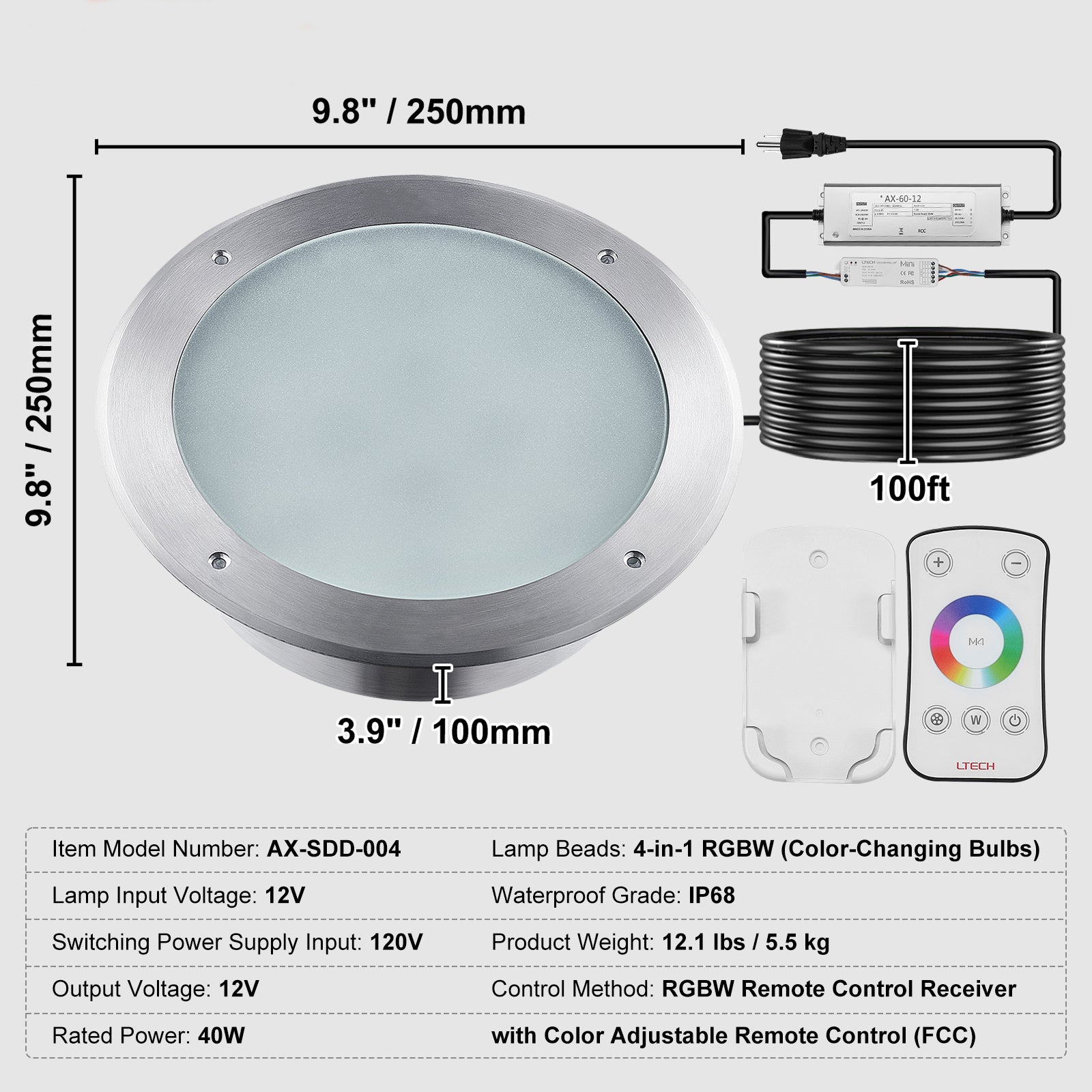 120V AC LED Pool Light, 10in 40W, RGBW Color Changing Inground Swimming Pool Spa Light Underwater, with 100 FT Cord Remote Control, Fit for 10 in Large Wet Niches, IP68 & Tested to UL Standards
