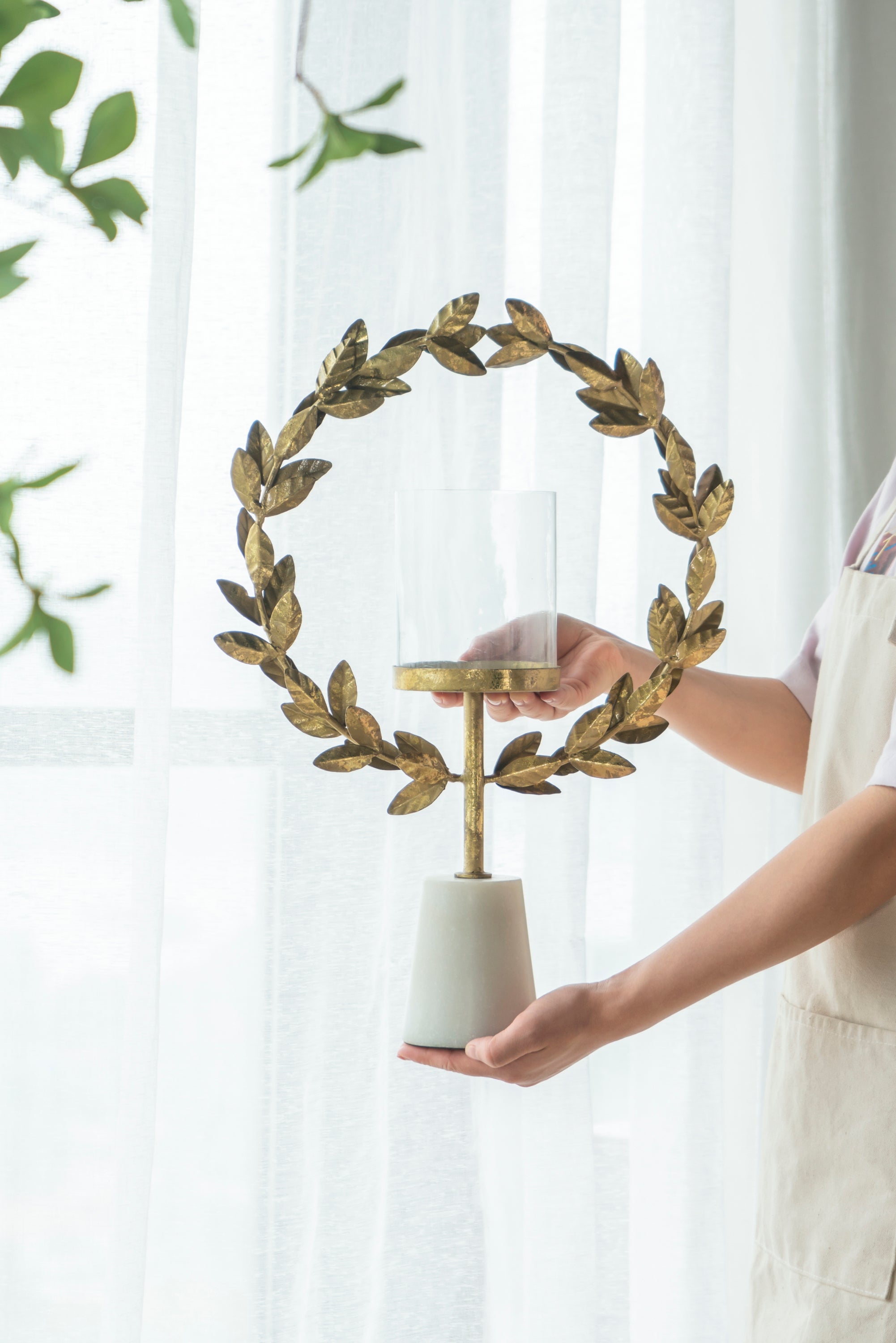 ELEGANT IRON & MARBLE | 19.7" TALL FLORAL HURRICANE | LUXURY CANDLE LANTERN | MODERN TABLETOP CENTERPIECE