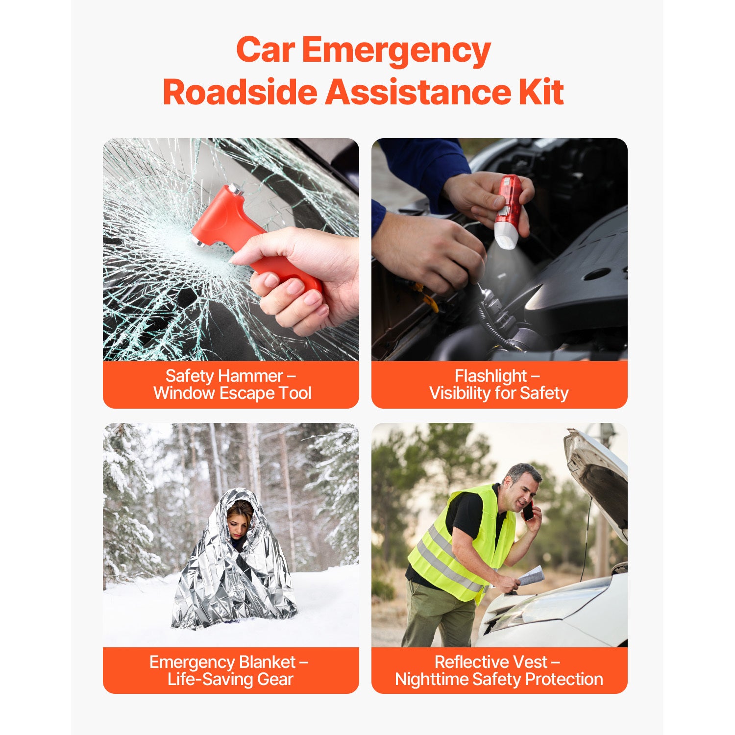 - Multifunctional Tool Kit: Our emergency car kit is packed with essential repair tools plus a folding shovel, flashlight, security gloves, poncho, and emergency blanket—ready for any roadside or outdoor emergency