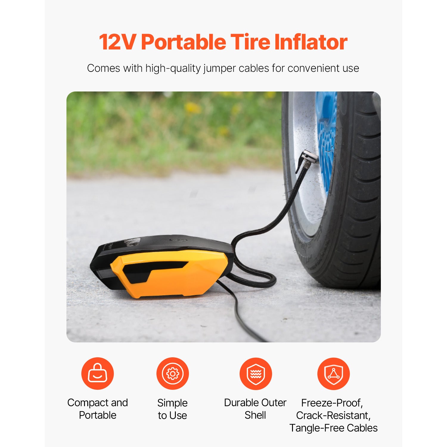 - Premium Cables & Fast Inflation: Features a 12V portable air compressor—compact yet powerful. Plug into your car’s cigarette lighter to inflate tires in seconds. Includes 12 ft / 3.6 m red (positive) and black (negative) jumper cables for quick jump-starts