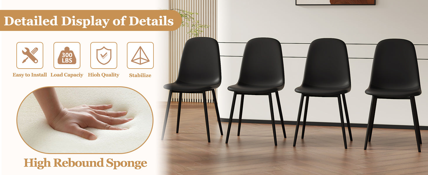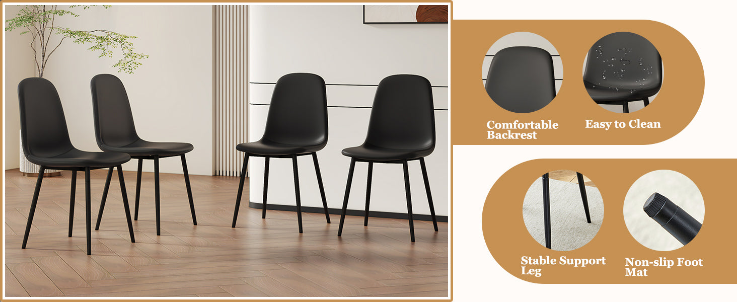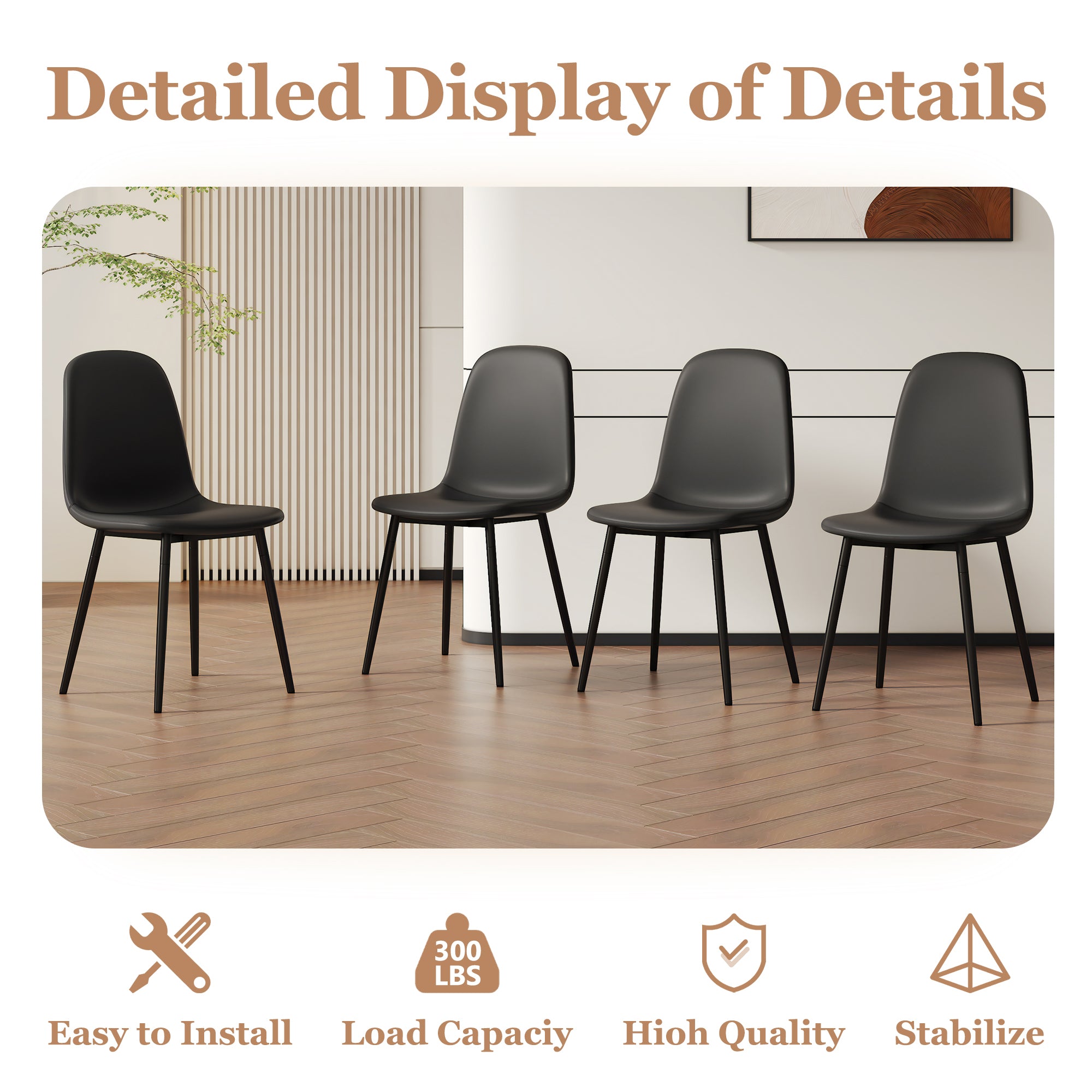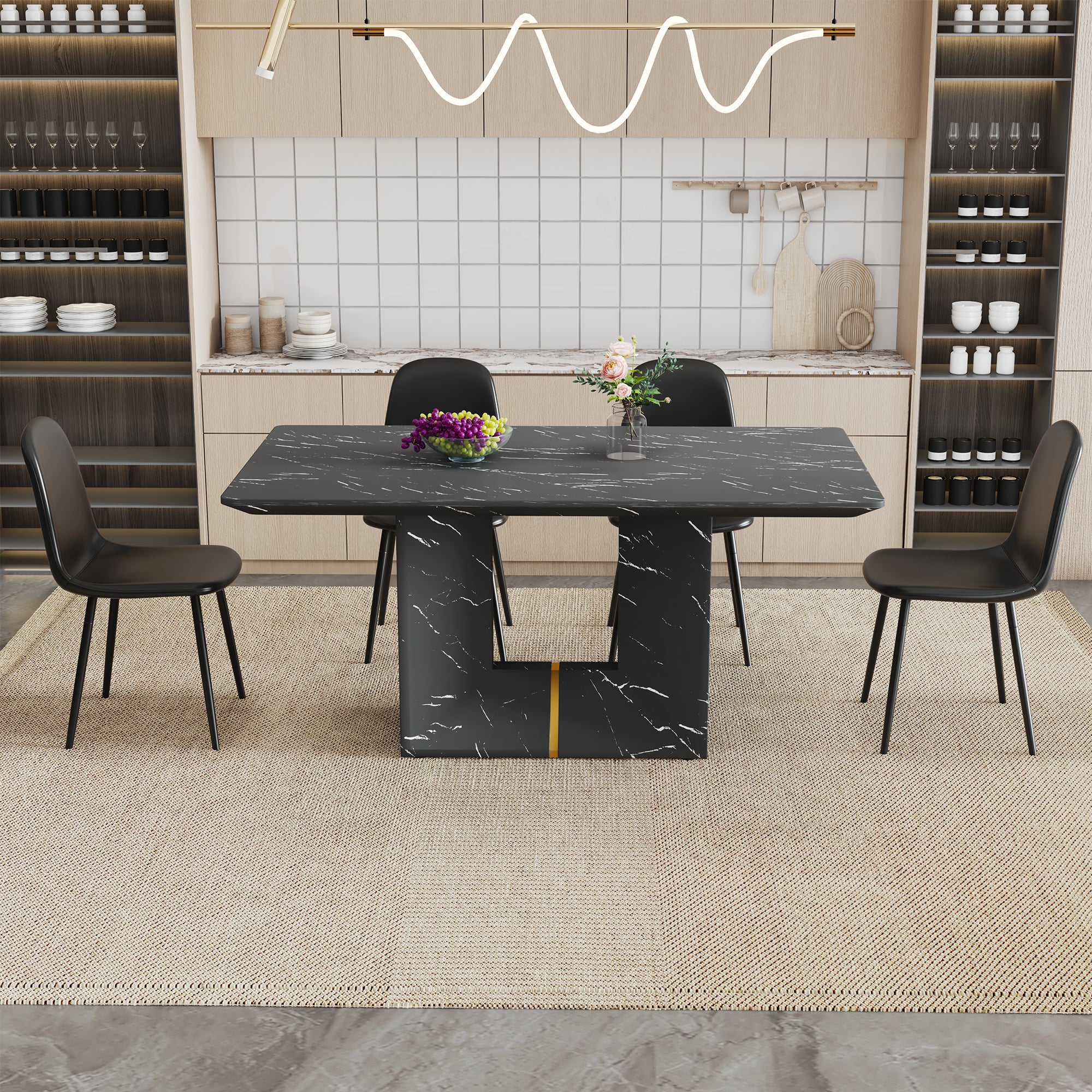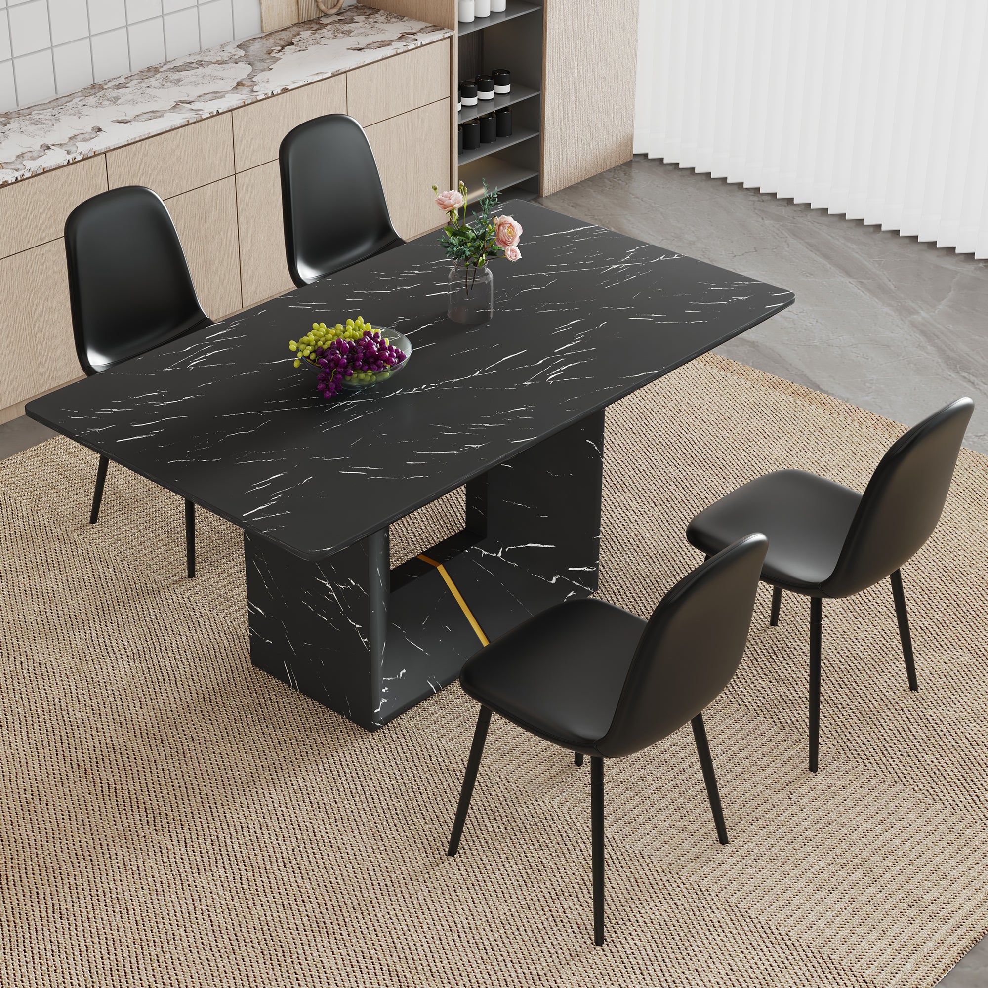 Elevate your dining space with this 5-piece dining table set, featuring a sleek 63"x35.4" black marble pattern MDF tabletop and four modern spoon-shaped side chairs. The chairs are upholstered in black PU leather with a Mid-Century Modern design, offering both comfort and style. Perfect for kitchens, dining rooms, or open-concept spaces, this set combines elegance with durability. Each box includes four chairs and one table—ideal for family meals, entertaining, or stylish everyday use.