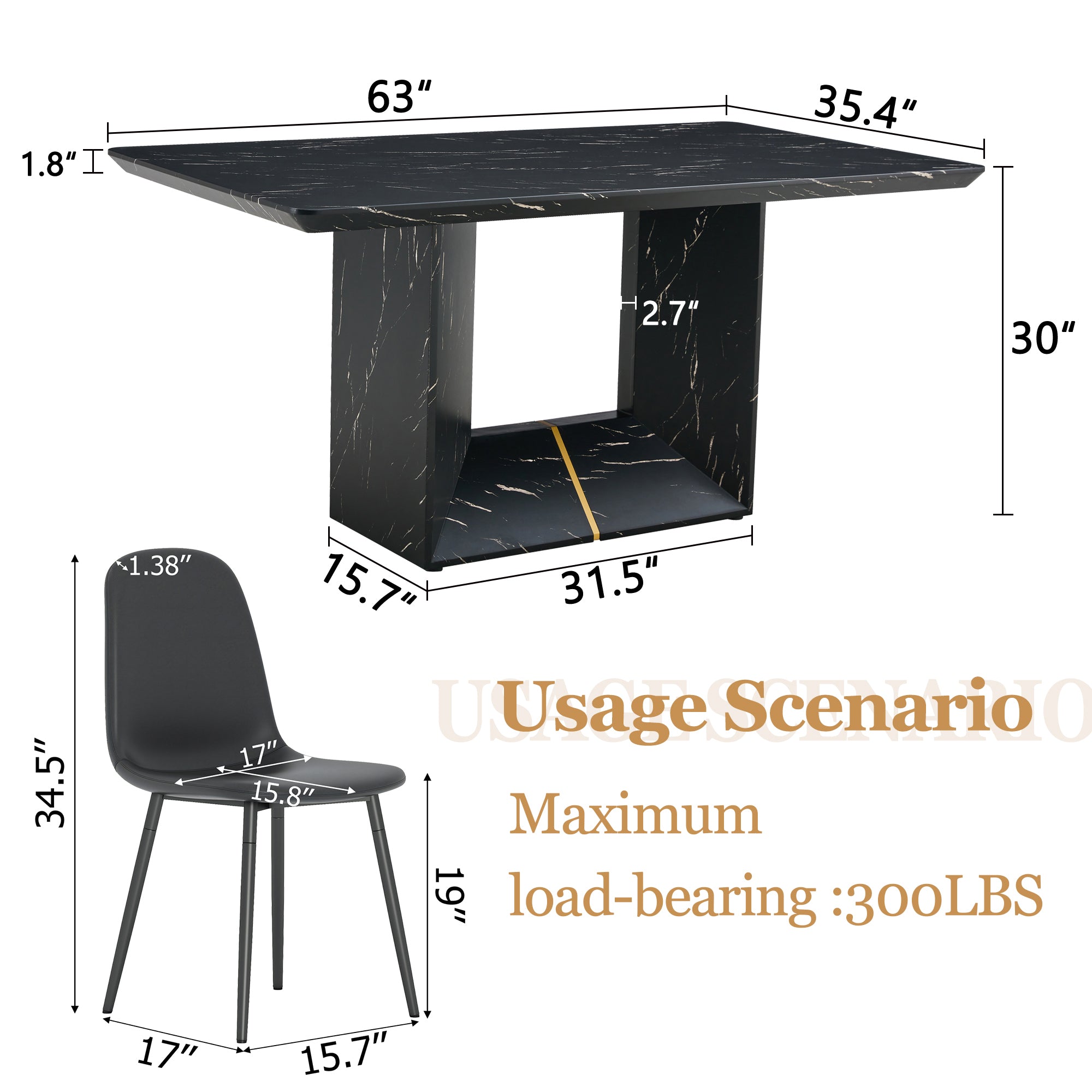 5-Piece Dining Table Set – 63"x35.4" Black Marble Pattern Table with 4 Mid-Century Modern Upholstered Black PU Chairs
