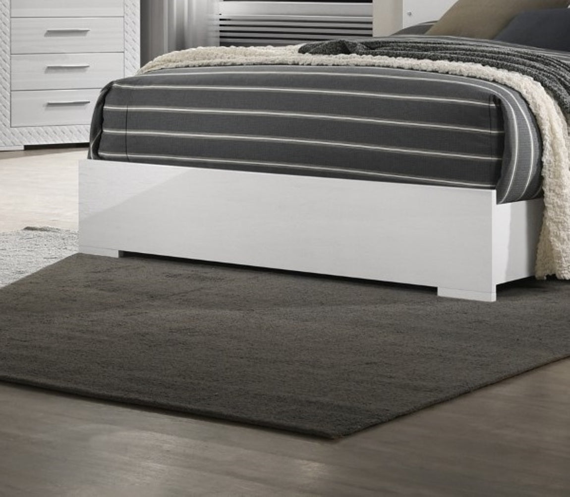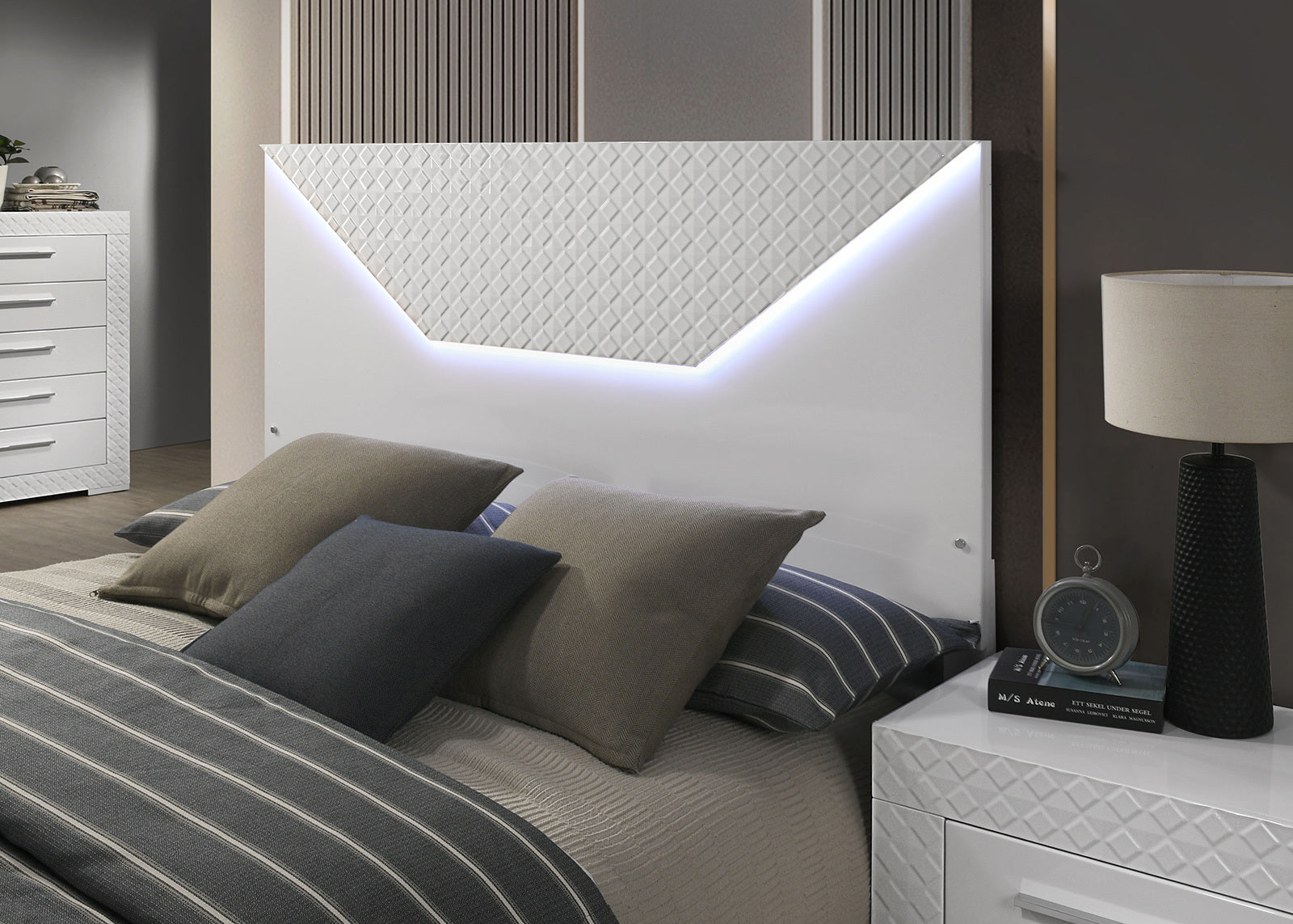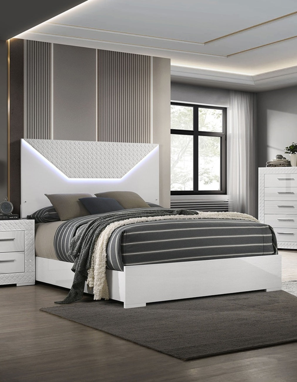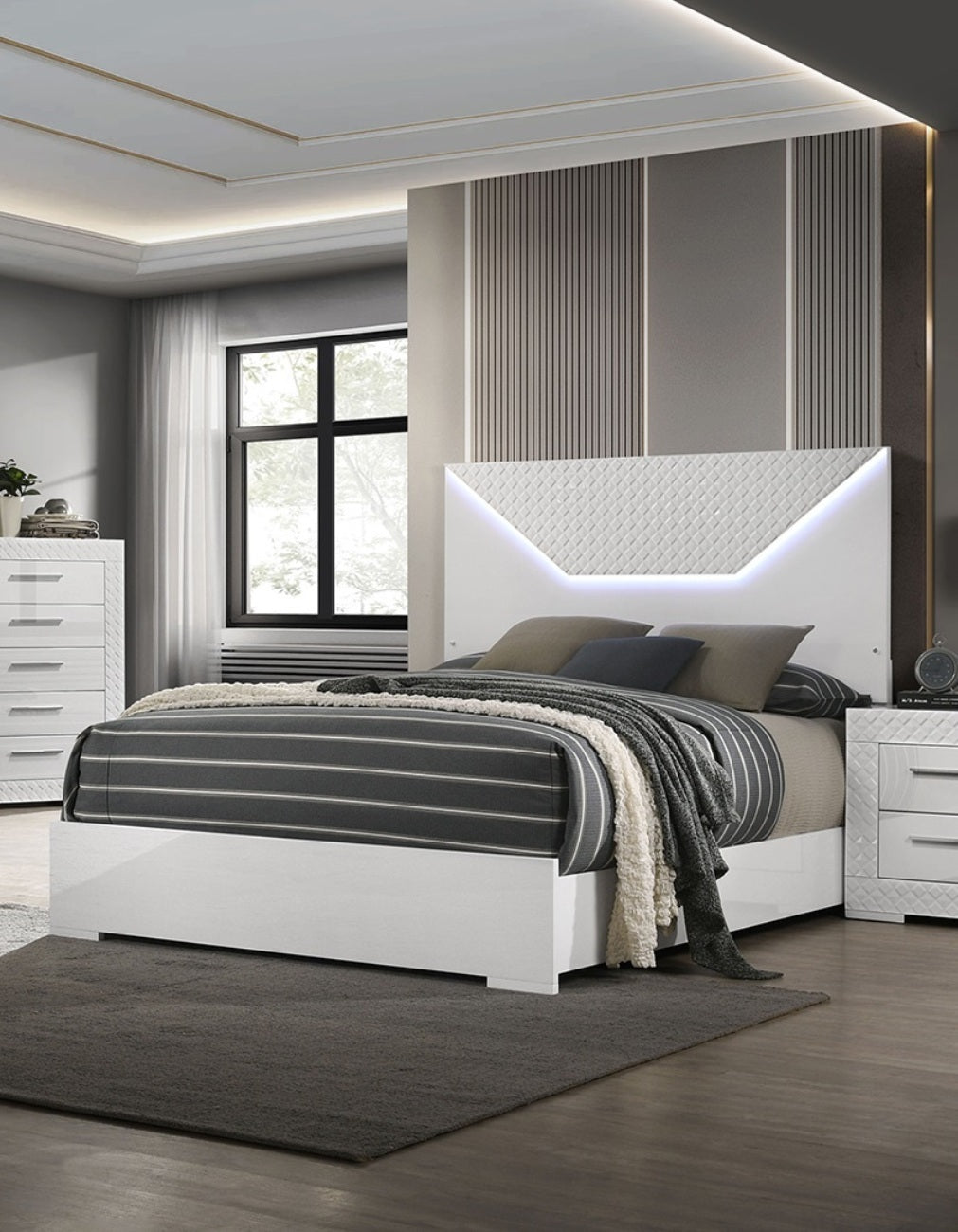 Product Description: Transform your bedroom into a luxurious modern retreat with this stunning White Queen Size Bed. Its sleek, high-gloss finish reflects light beautifully, creating a clean and elegant focal point. The truly unique design of the headboard is enhanced by integrated LED lighting, allowing you to customize your room's ambiance with a soft, captivating glow. This 1pc bed is the perfect blend of contemporary style and innovative functionality, providing a stylish platform for your mattress and a sophisticated upgrade to your bedroom furniture.