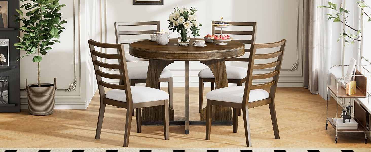 Bring style and versatility to your dining space with the TREXM 5-Piece Round Dining Table Set, designed to seat four comfortably. Featuring a beautifully crafted extendable round table with a 16-inch removable middle leaf, this set easily adapts to your entertaining needs—perfect for everyday meals or hosting guests.