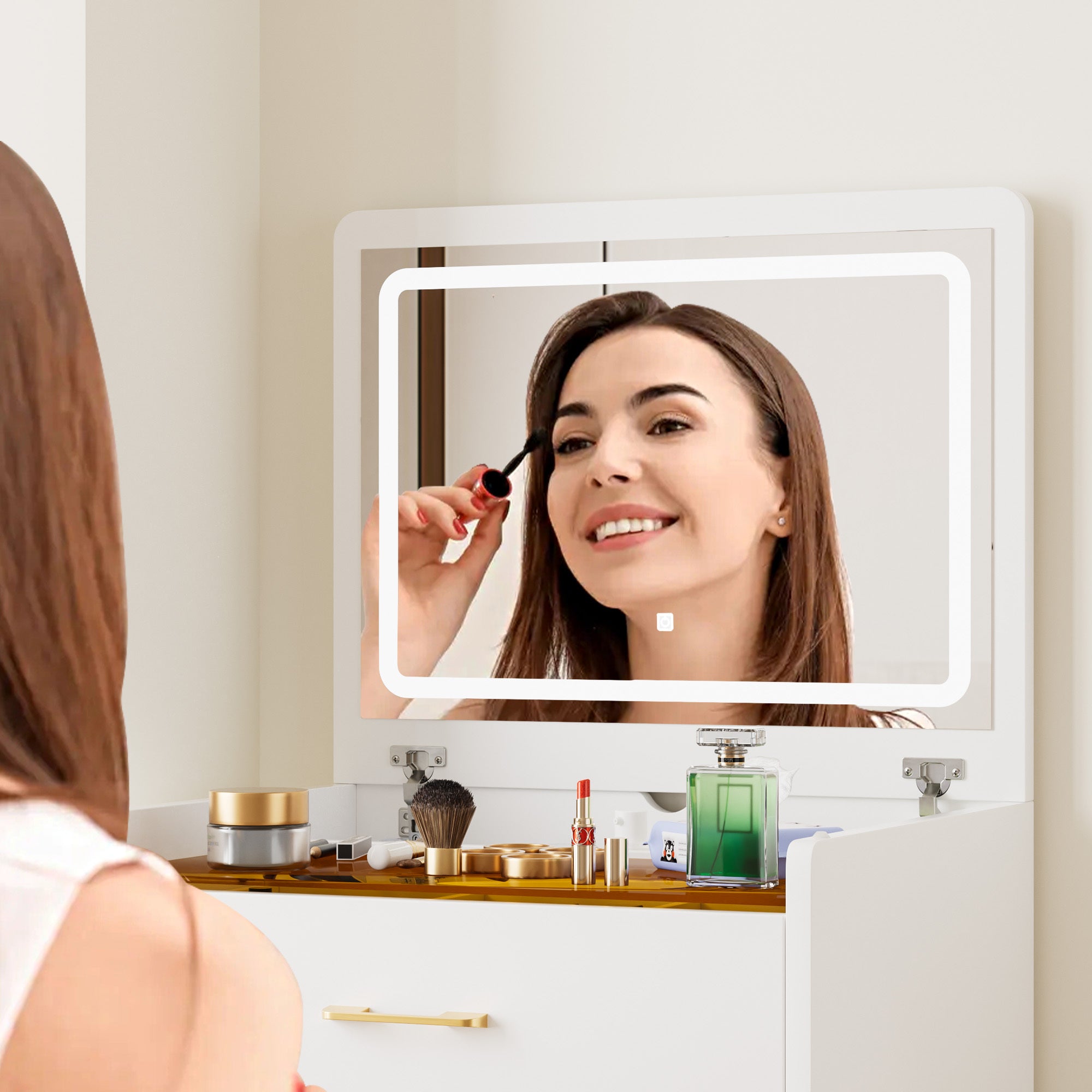 Product Description: Optimize your beauty routine with our 23.6'' wide makeup vanity table! This innovative 3-in-1 vanity desk features a convenient flip-top lighted mirror for perfect illumination, along with a visible glass top. It boasts 3 drawers for ample storage, a comfortable upholstered stool with storage, and a built-in power outlet for your tools. A versatile and organized solution for any bedroom or dressing area