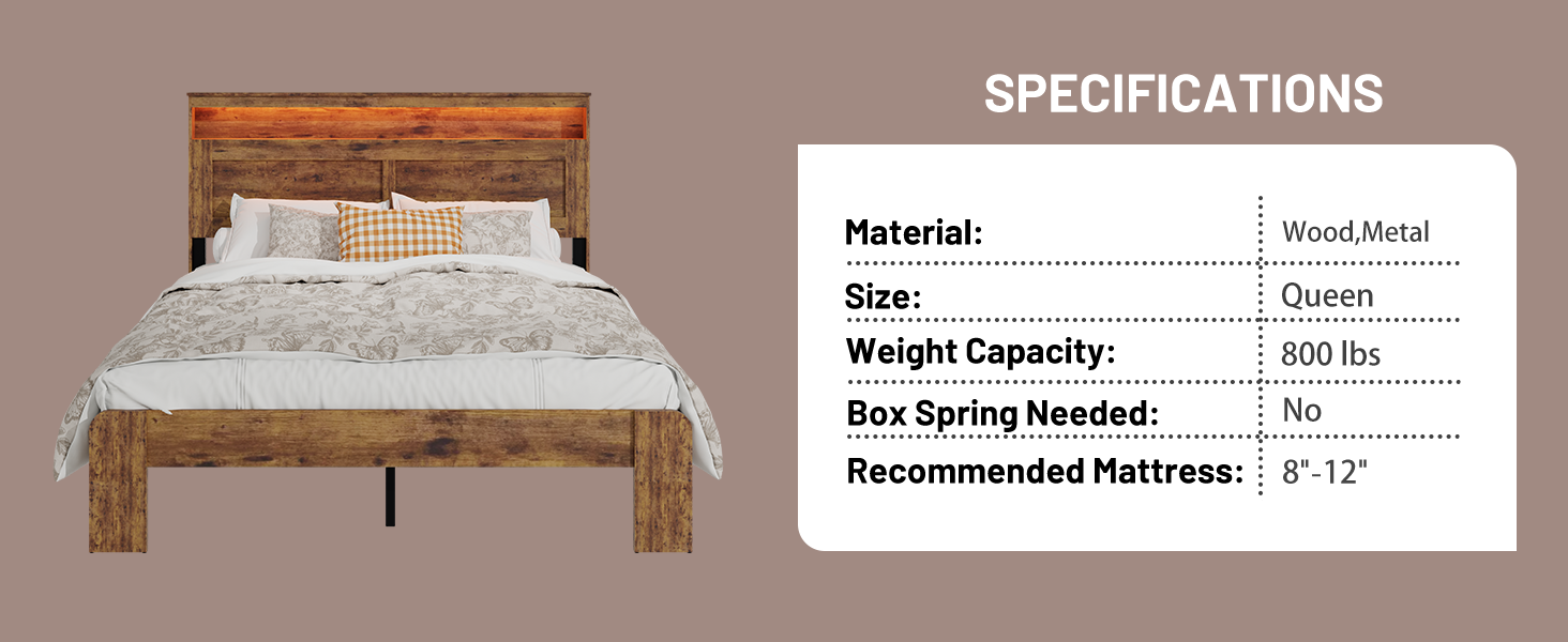 Product Description: Upgrade your bedroom with this modern Queen size bed frame that combines style and smart functionality. Featuring a built-in LED light headboard for perfect ambient lighting and two integrated USB ports to charge your devices, this dark brown wood platform bed is the ultimate blend of convenience and comfort.