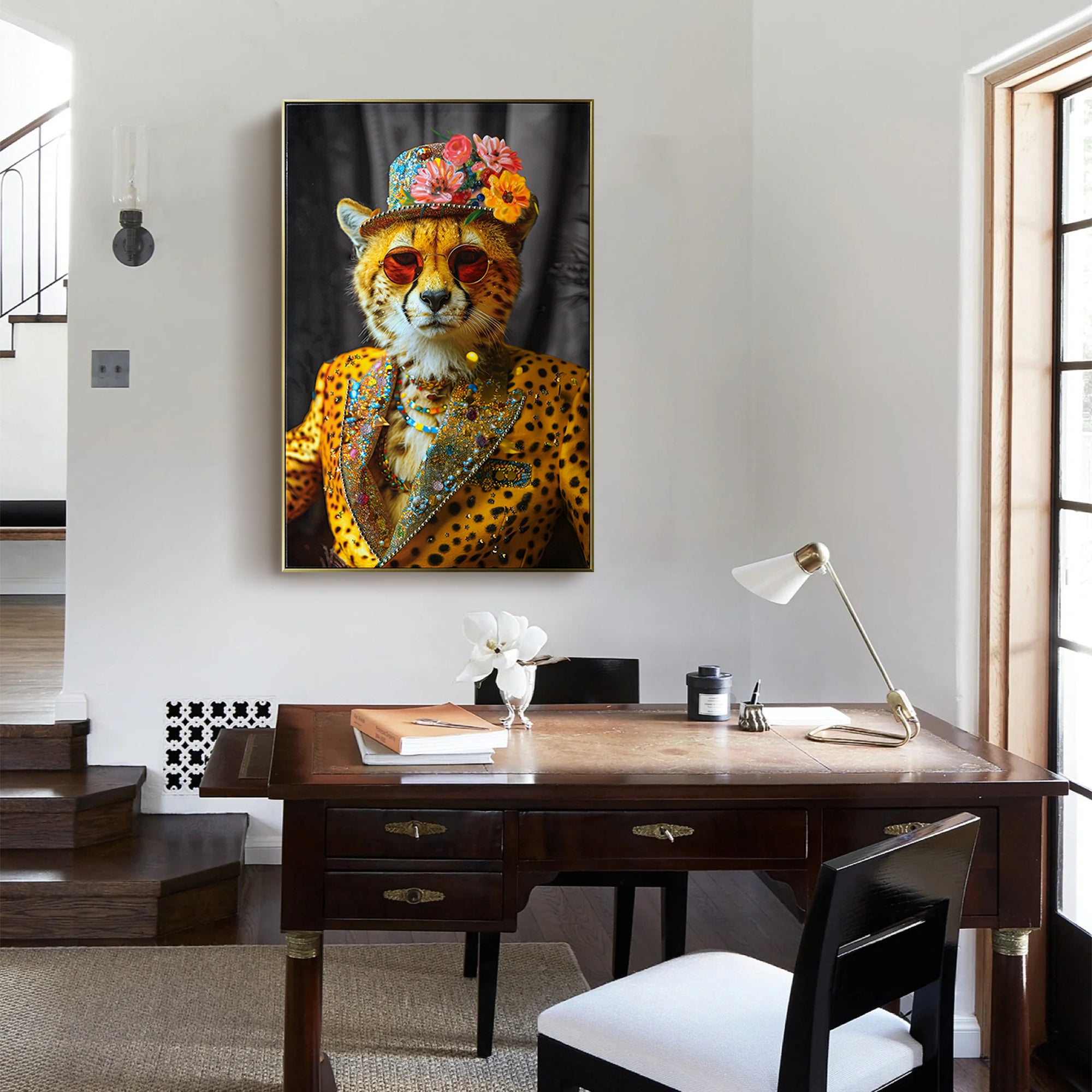 Abstract Art Wall Decor | Stylish Cheetah in a Leopard Print Suit, Sunglasses & Hat - Modern Canvas Painting