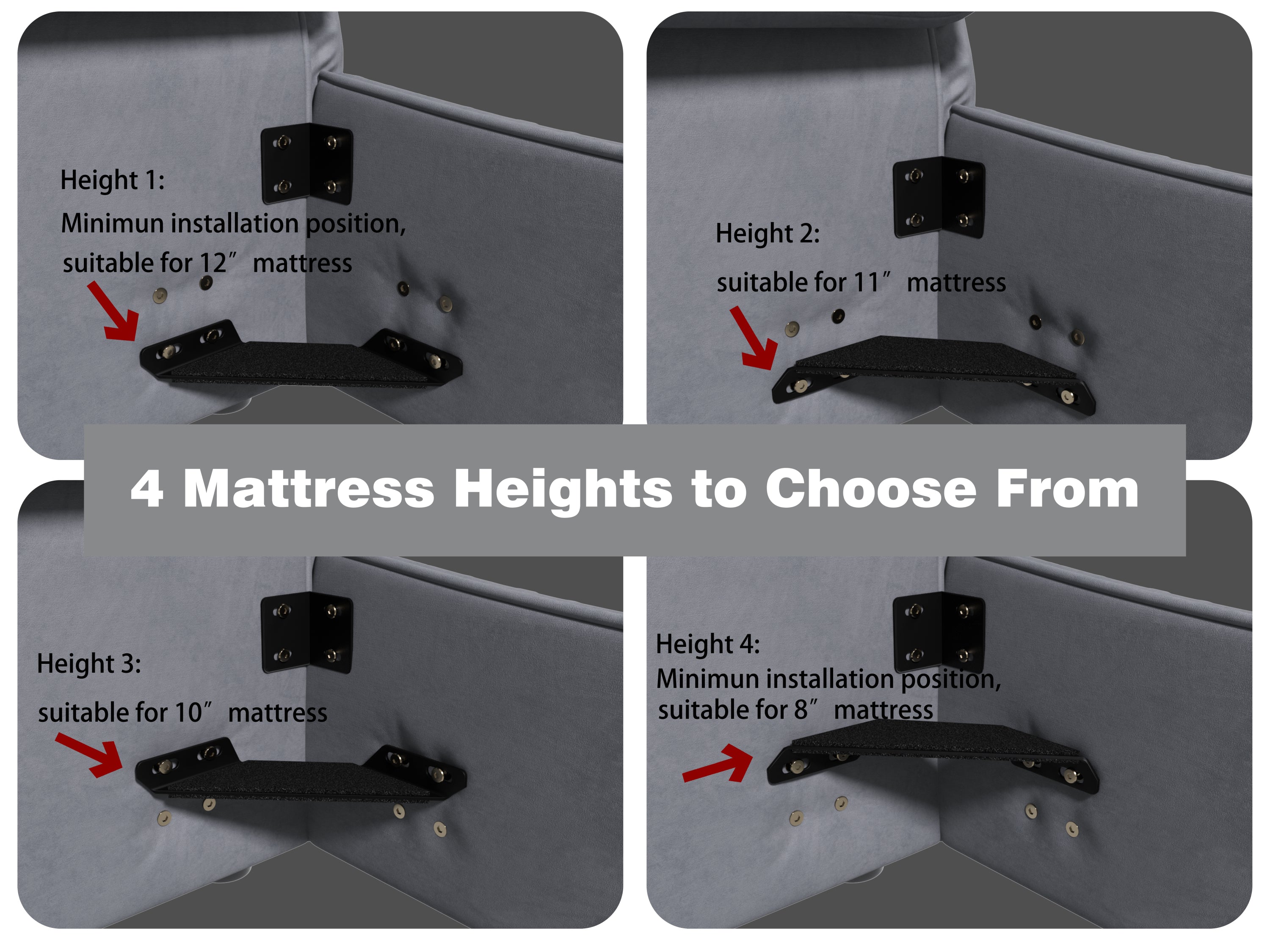 - [Multiple heights of mattresses are available for selection]: through different installation methods of the bed frame, it can be suitable for multiple mattress heights(8',10',11',12').