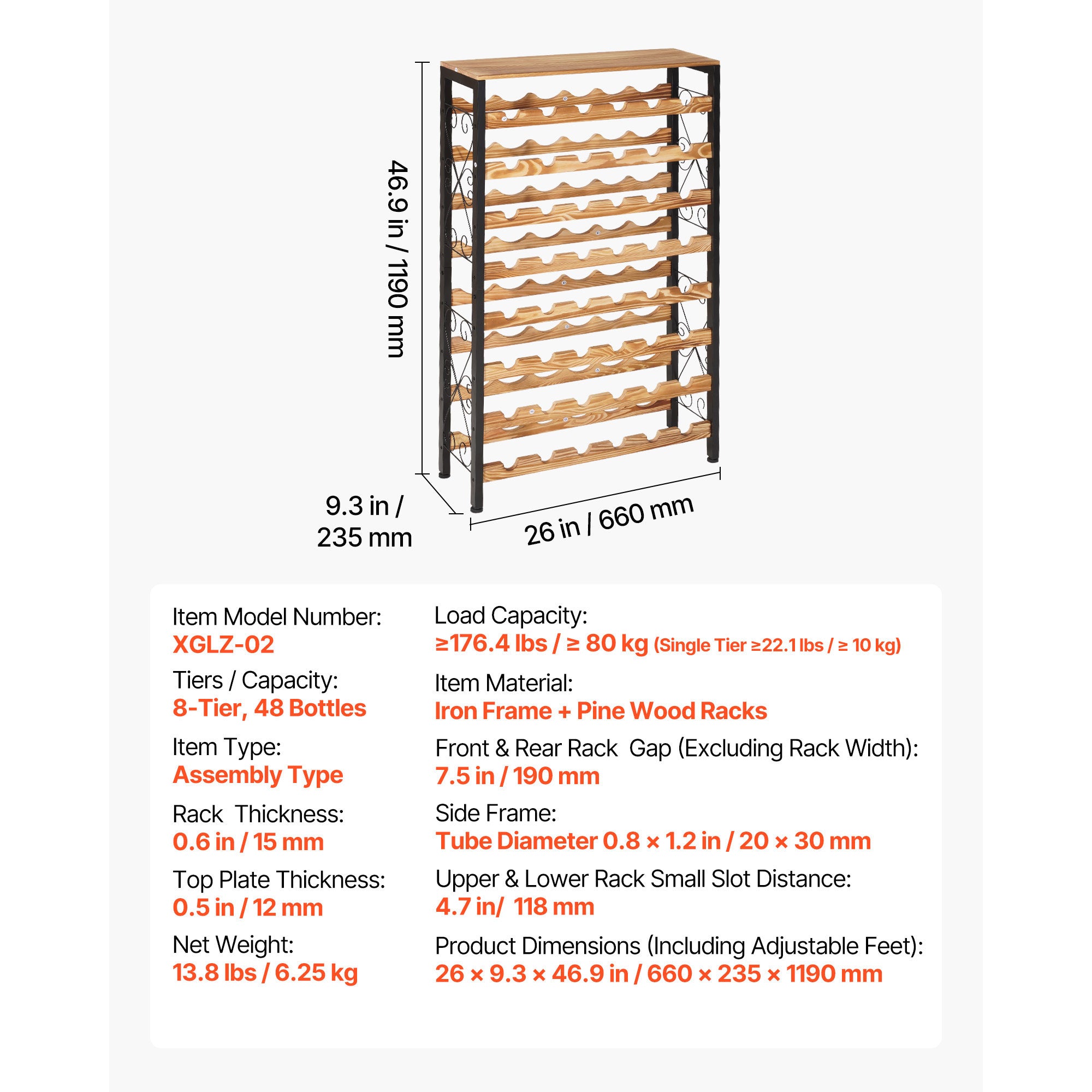 - Large Capacity: This 8-tier wine rack free standing floor can hold up to 48 bottles. It is ideal for organizing and displaying your wine collection, meeting the storage needs of your family’s wine bottles