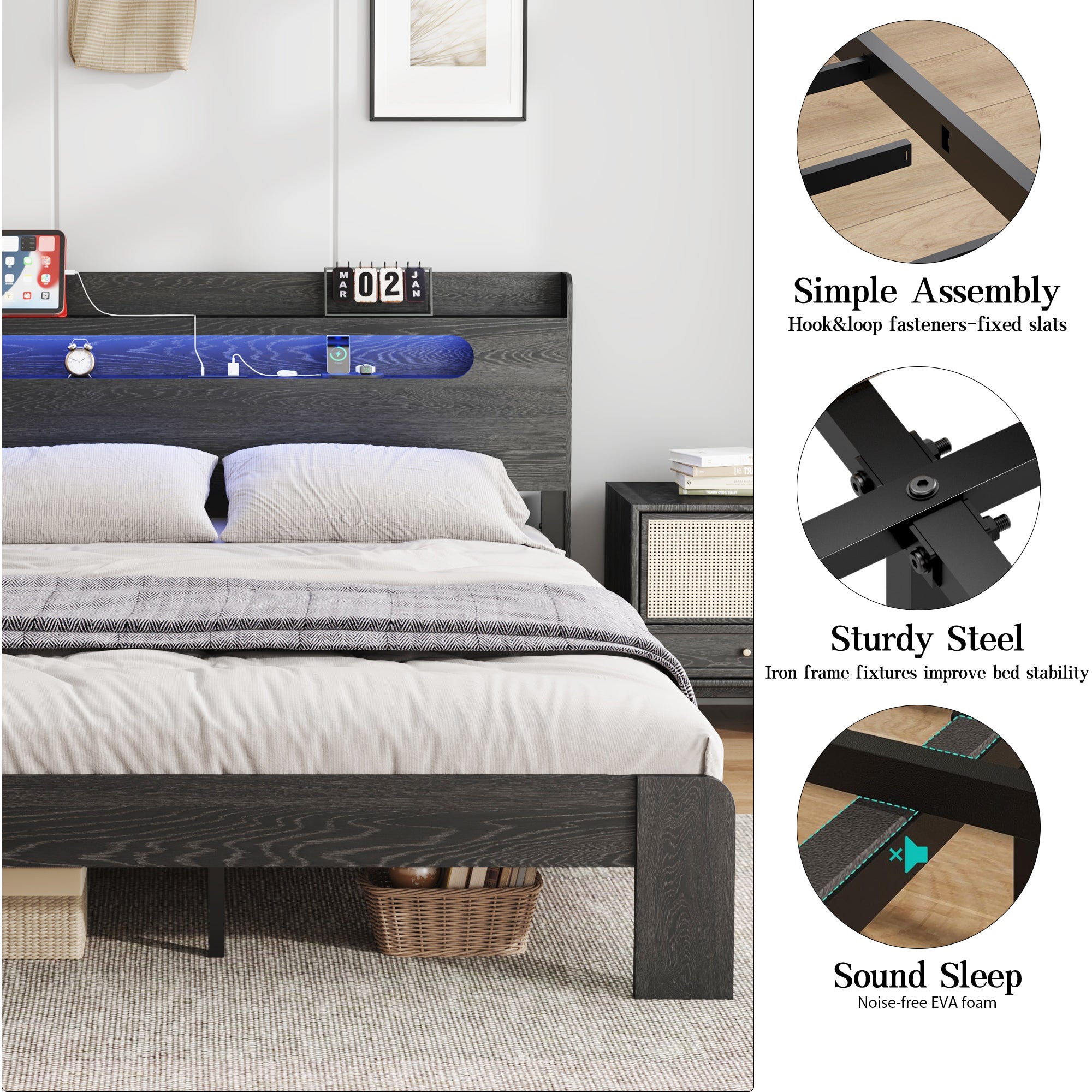 - Product Description: Upgrade your bedroom with this modern Queen size wood platform bed frame in sleek black. Enjoy ultimate convenience with a built-in LED light headboard and 2 USB ports for charging devices. This noise-free design eliminates the need for a box spring and offers large under-bed storage for organization. With easy assembly included, it's the perfect blend of style, comfort, and functionality for your master bedroom.