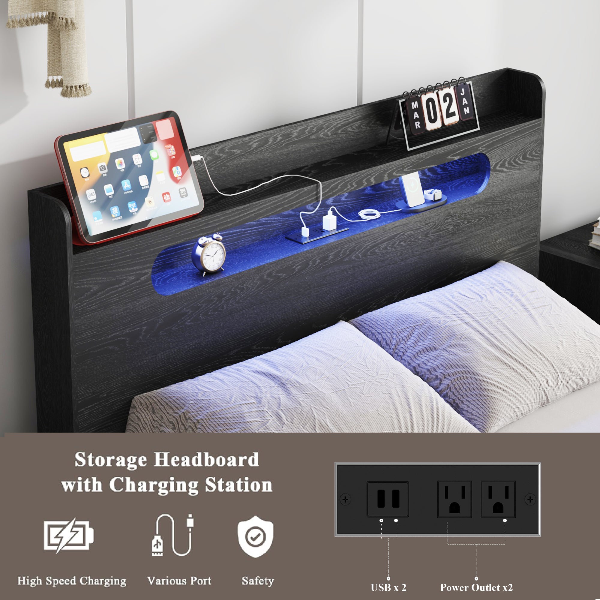 - [Storage Headboard with Charging Station] 2 Standard Plug Outlets & 2 USB Ports with Cable Management 6 ft long power supply cord. Make charging and common small items such as phones, glasses, and books within easy reach.