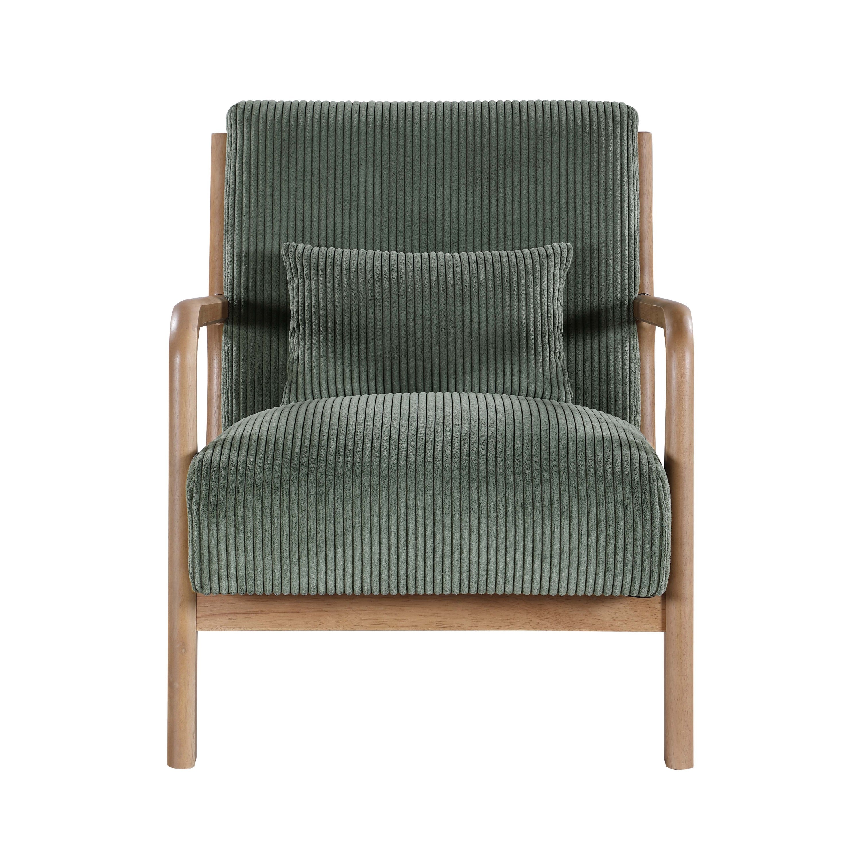 - Designed with a Scandinavian sensibility, this armchair features a solid wood frame in a warm natural finish, gently curved for a soft, welcoming silhouette.