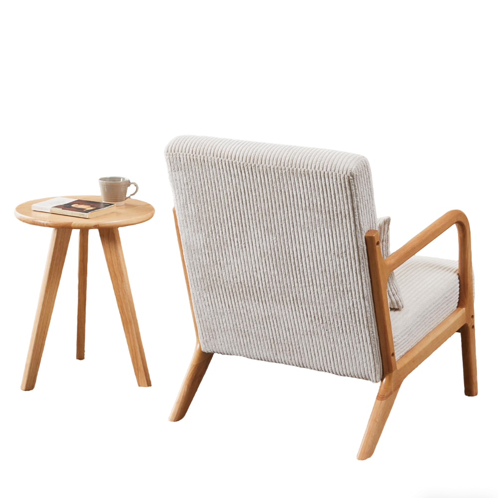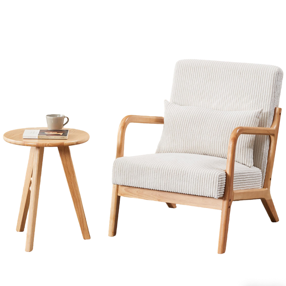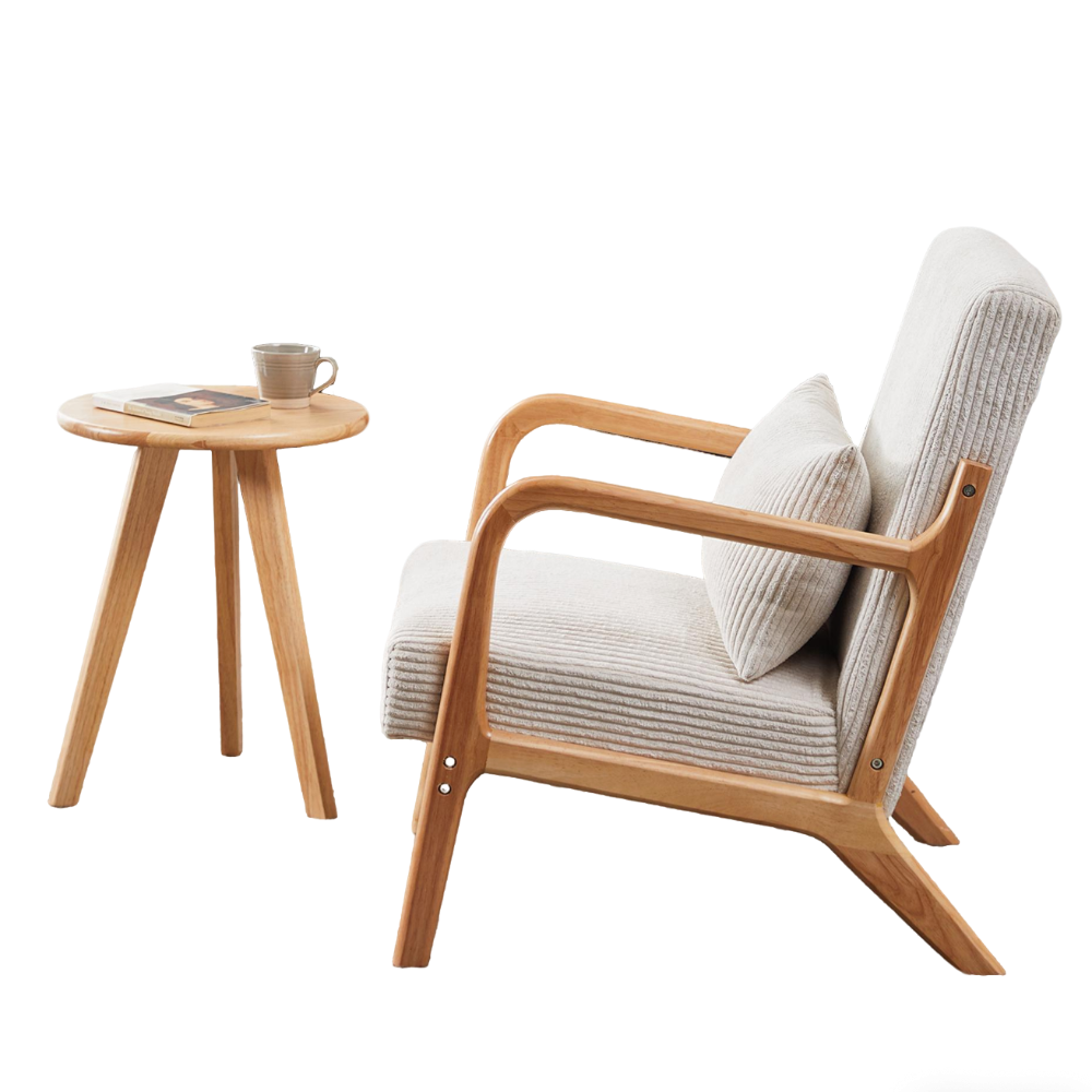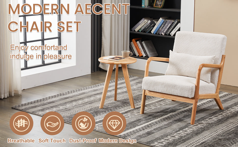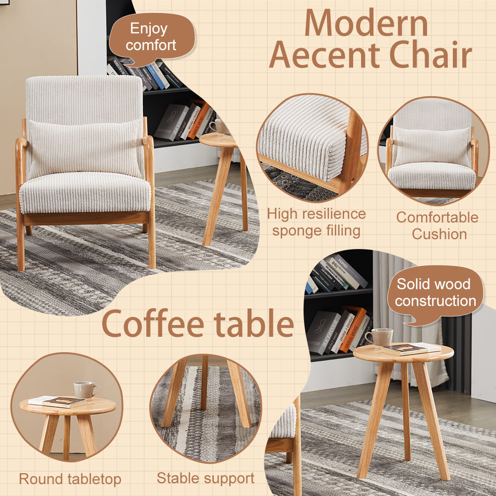 Mid-Century Modern Accent Chair & Coffee Table Set, Beige Lounge Chair with Natural Wood Table, Vintage Luxury Living Room Furniture