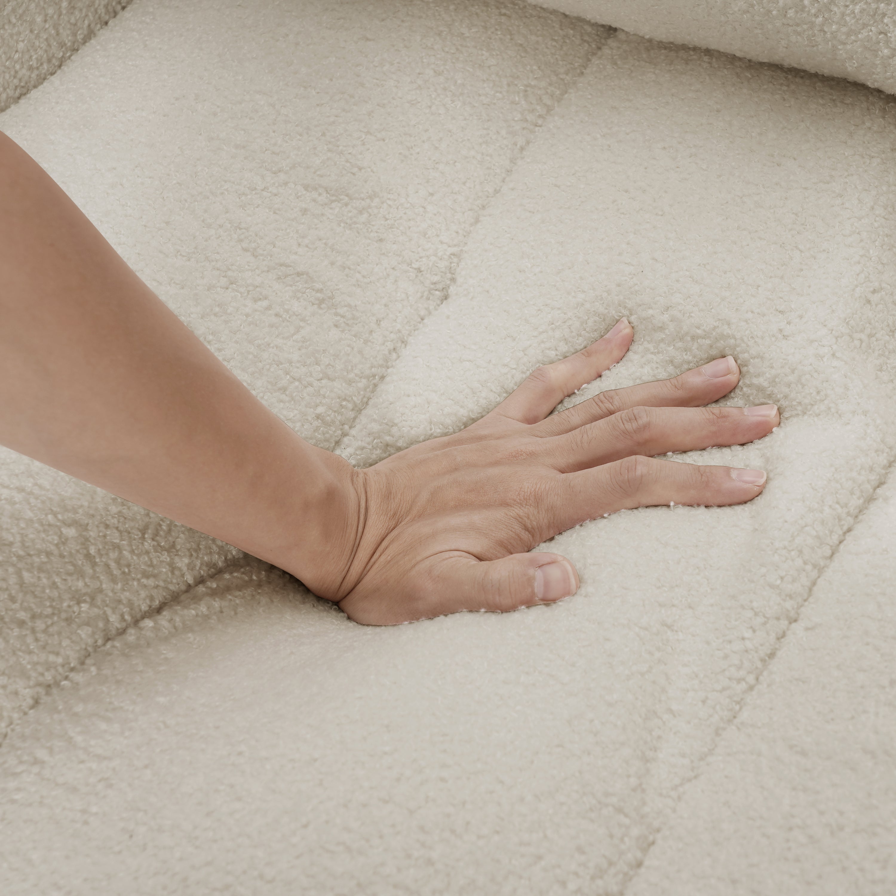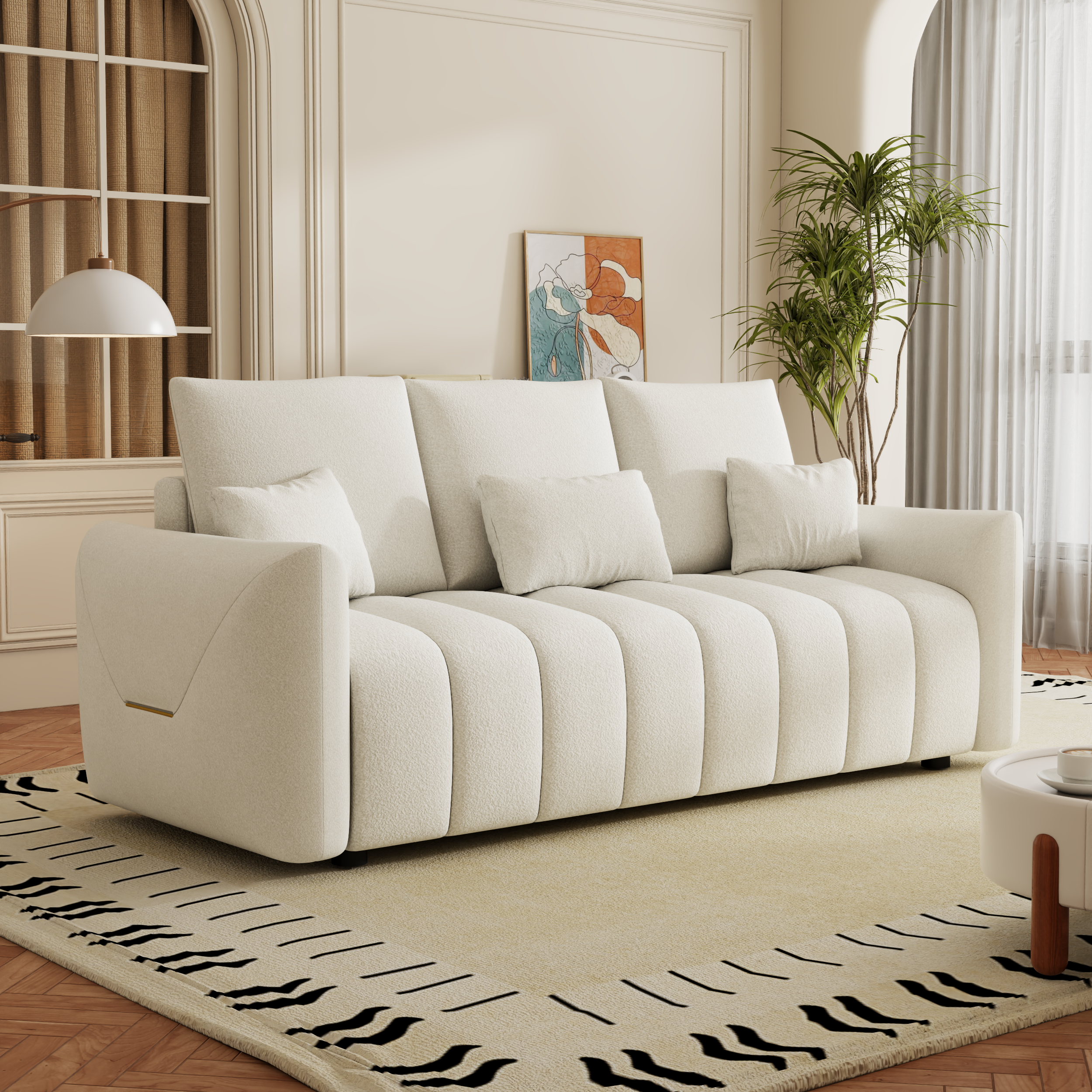 - The sofa is designed with smooth and clean lines, giving people a modern and simple feeling. The modern sofa is designed with teddy velvet material, which is comfortable to touch and easy to maintain.