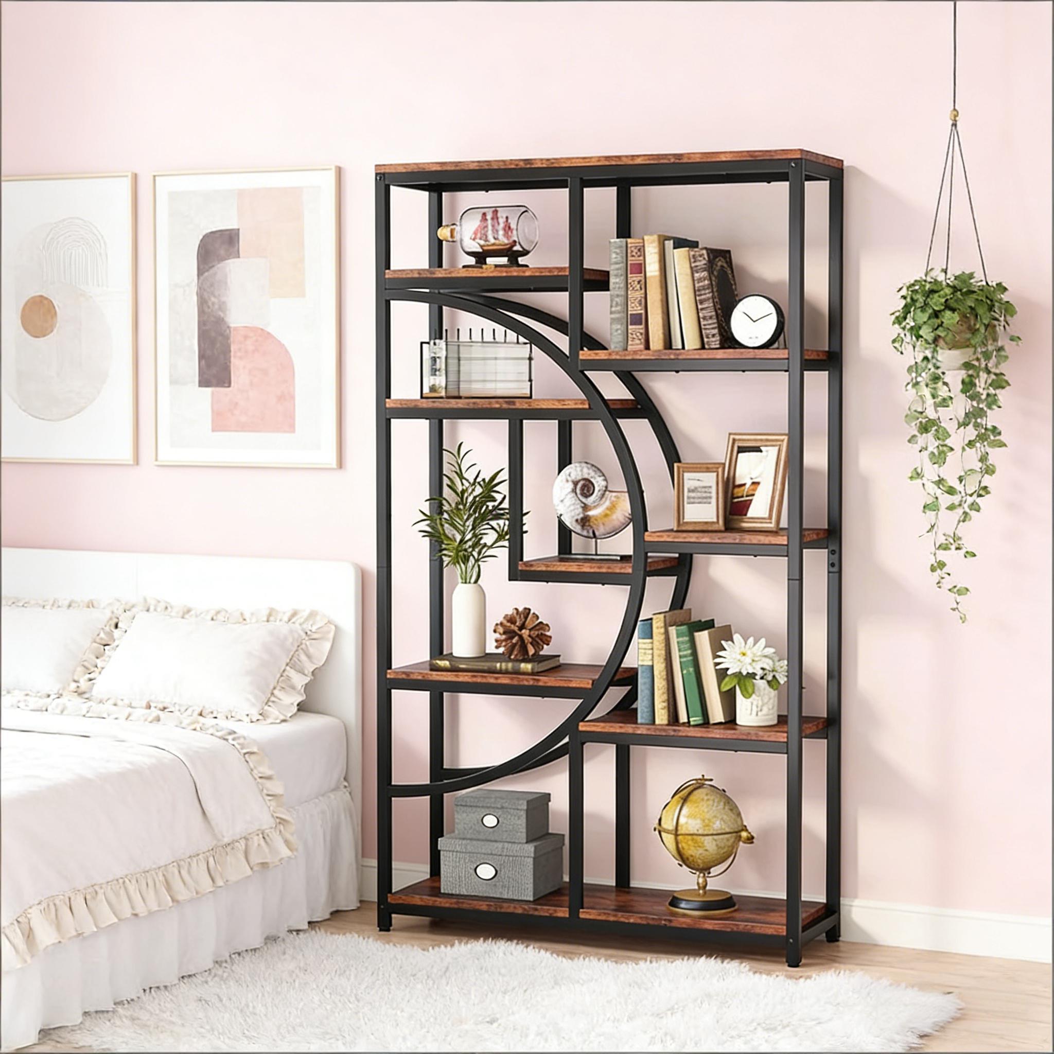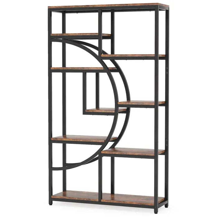- Sophisticated Geometric Design - This open bookshelf, featuring a black metal frame and rustic brown board, embodies an intricate half-moon design that enhances your home's aesthetics. Complement this unique piece by filling it with books, photos, plants, and other decor items.