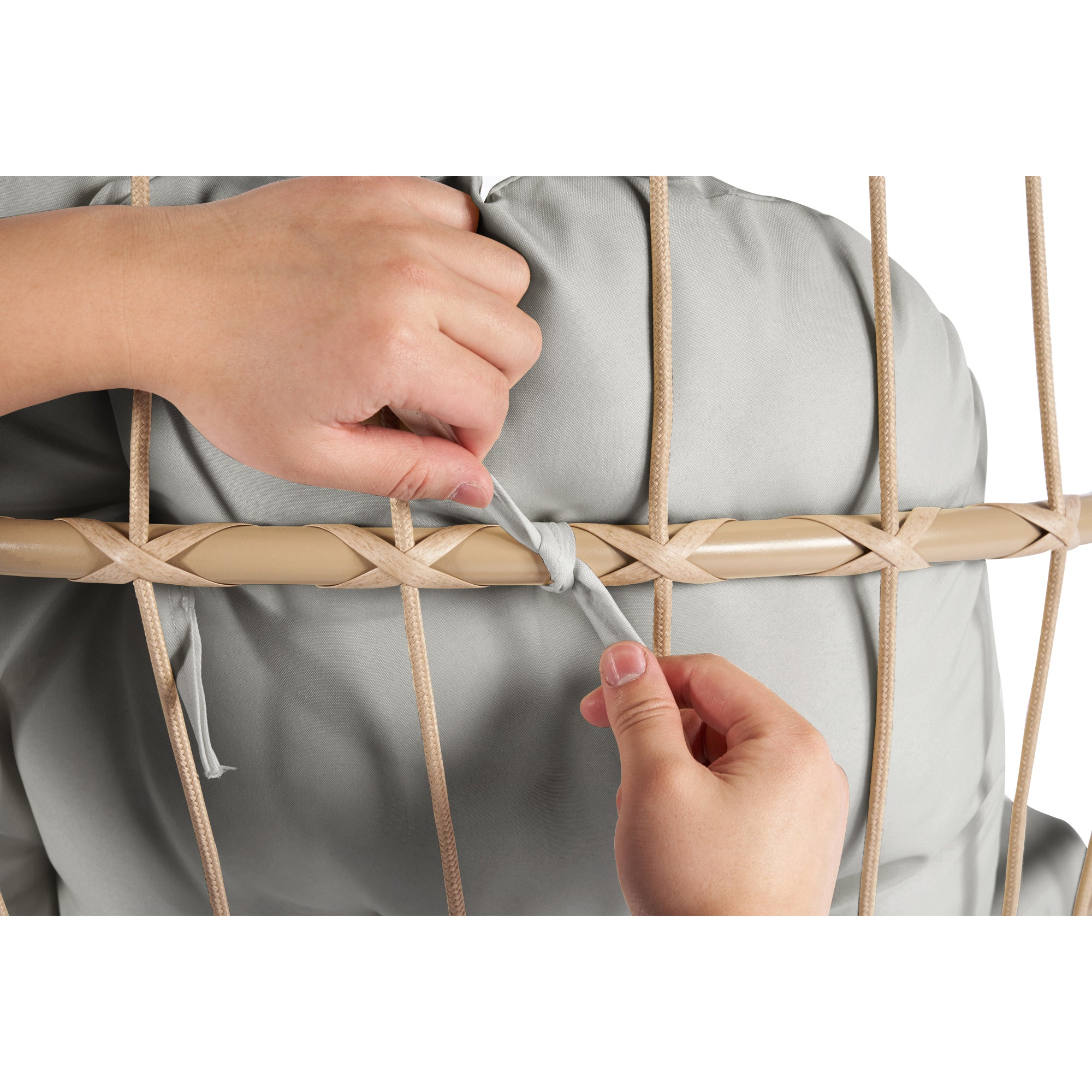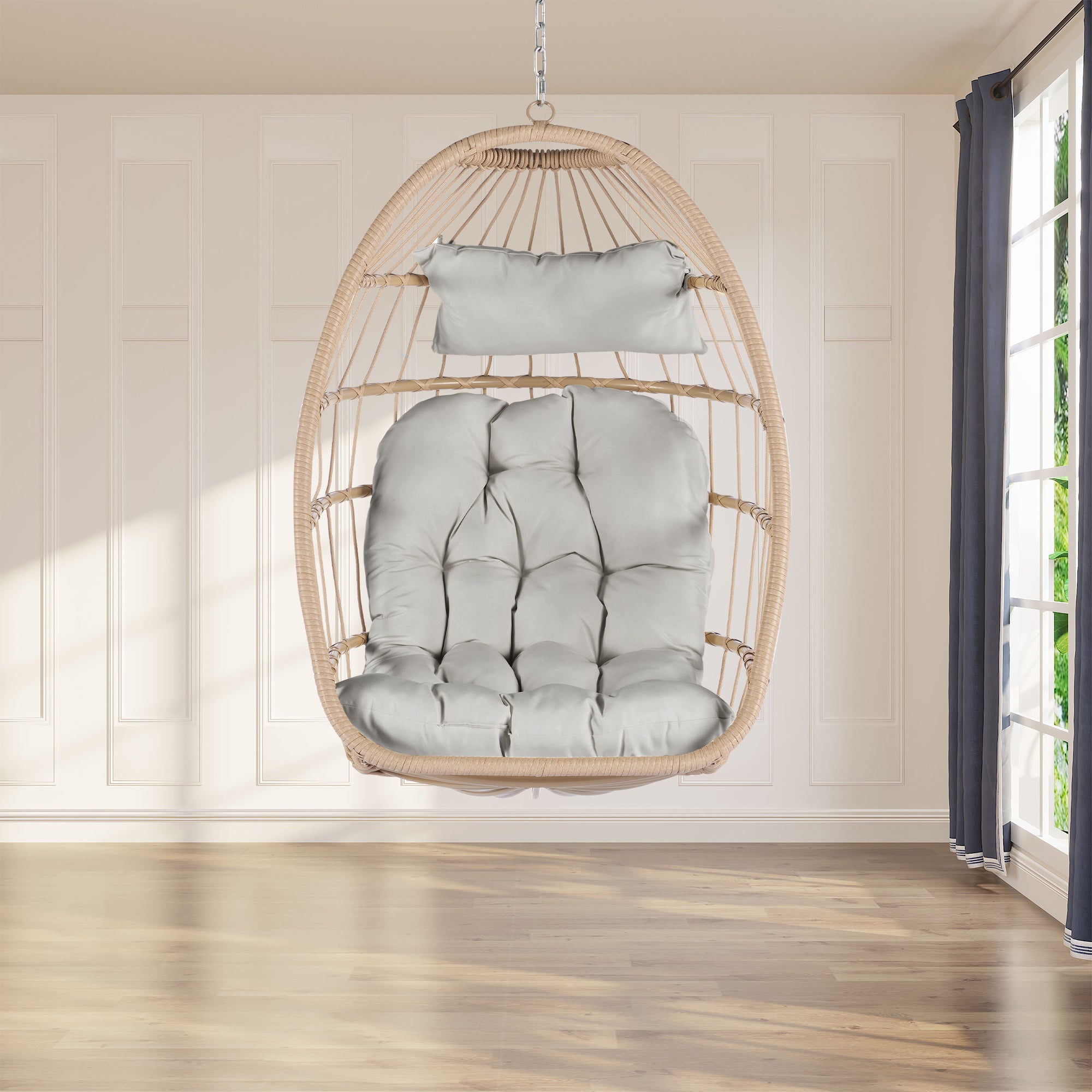 Crafted with durable rattan, this egg-shaped swing chair is not only visually striking but also built to last. The wooden frame adds a natural touch, while the soft, light gray cushion ensures comfort as you swing and relax. Whether you're enjoying a sunny day or a peaceful evening, this hanging chair offers a perfect balance of elegance, comfort, and durability.