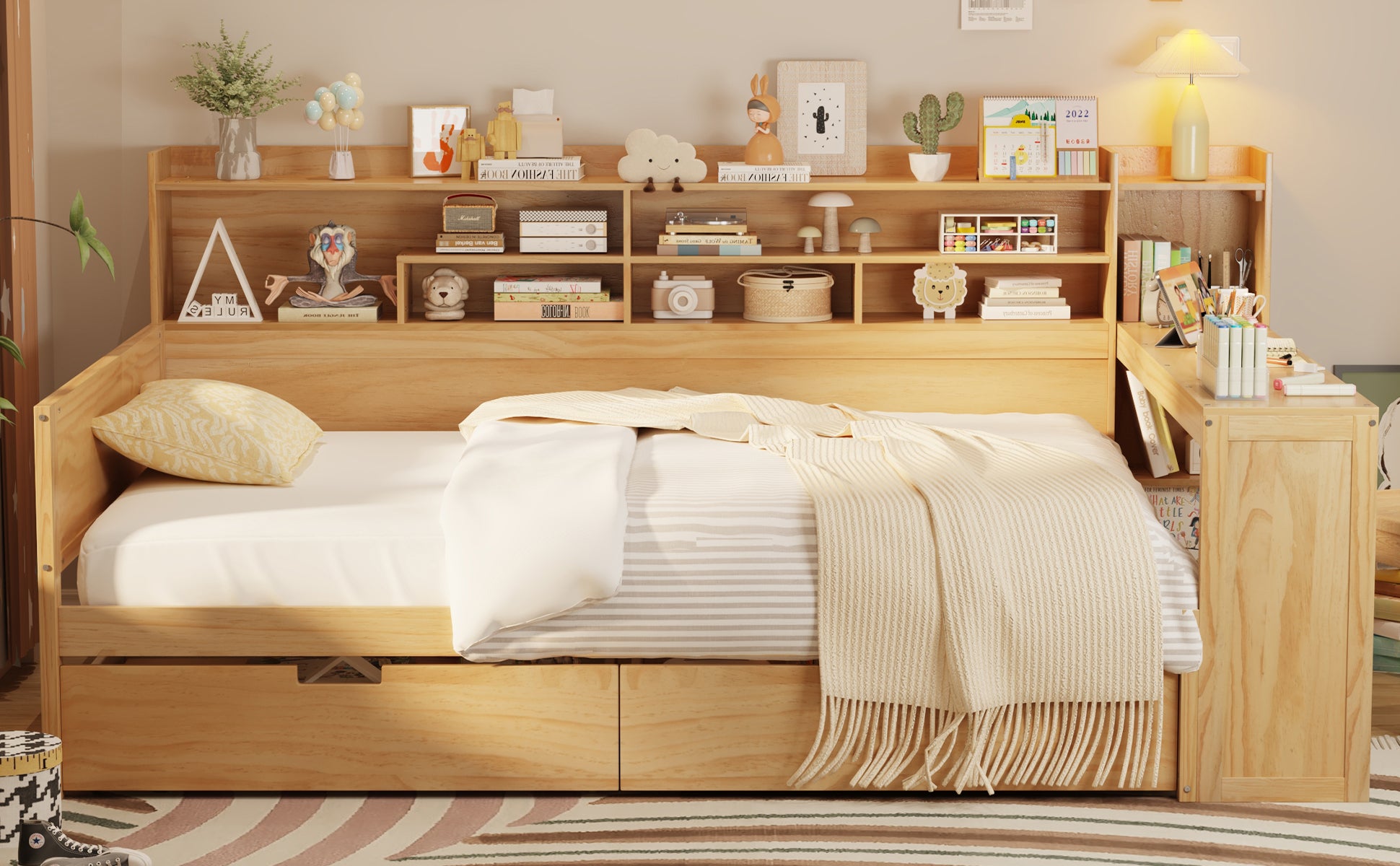 Wooden Daybed with Storage Shelves, Multi-functional Bed with Two Storage Drawers and Study Desk