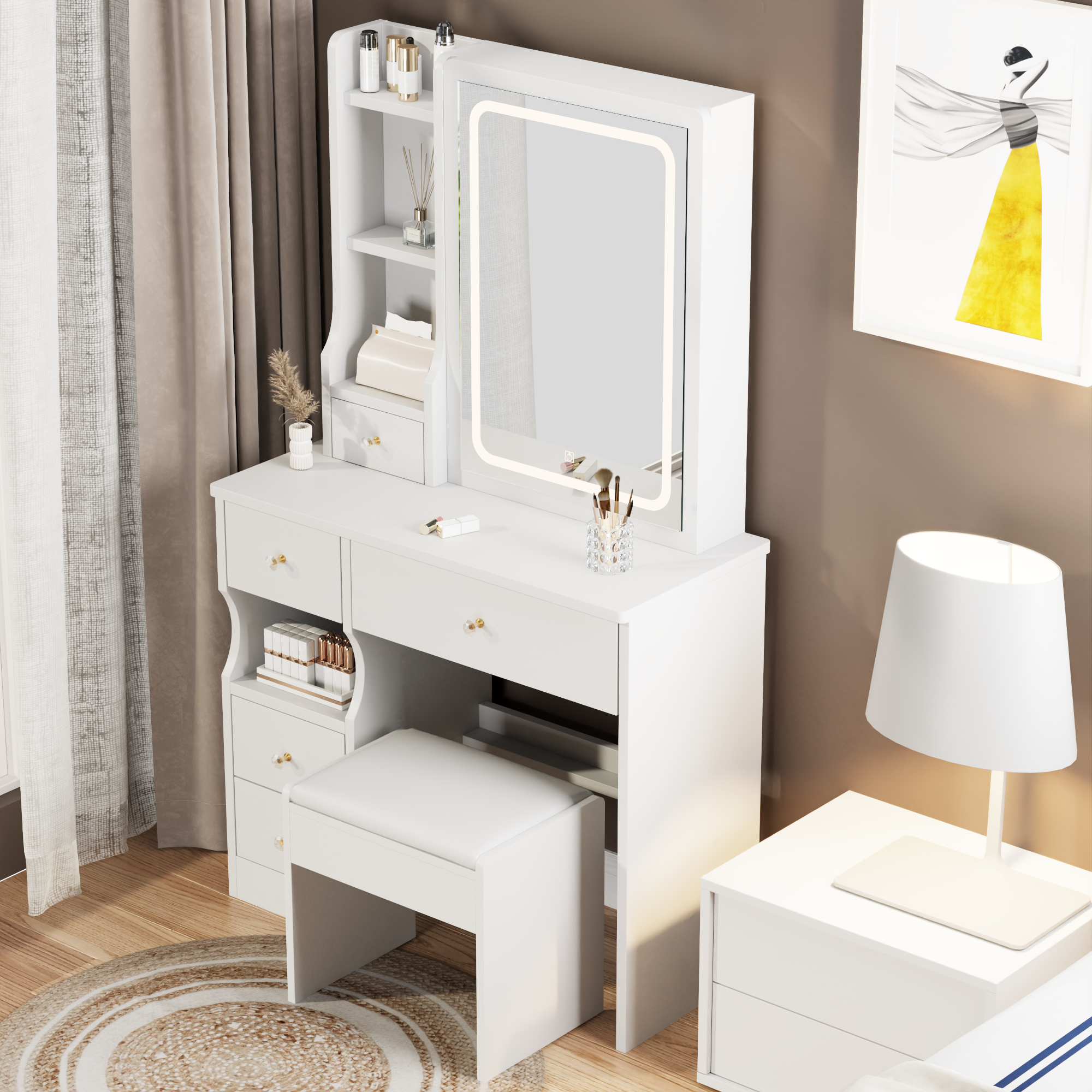 Small Space Left Drawer Desktop Vanity Table + Cushioned Stool, Extra Large Touch Control Sliding LED Mirror, Tri-color Switching, Brightness Adjustable, Suitable for Girls No More Than 5.6ft Tall