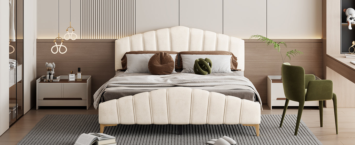 Elevate the style and comfort of your bedroom with the Queen Size Velvet Platform Bed in a sophisticated beige color. Designed with a thick fabric upholstery and a stripe decorated headboard, this bed adds a modern, luxurious touch to any room. The plush velvet surface offers both softness and durability, creating a cozy and inviting atmosphere for restful sleep.