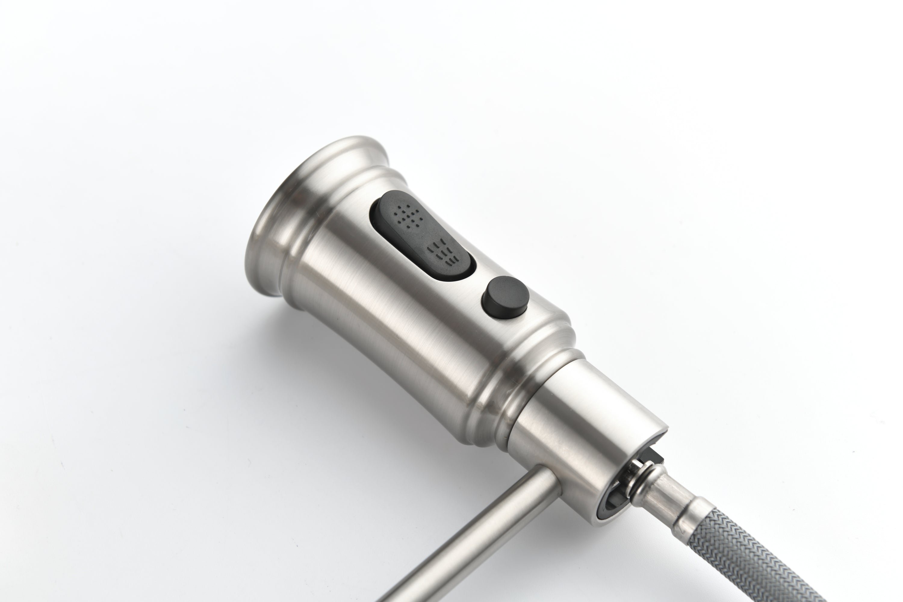 • The pull-out spray head is designed to fit in a variety of sinks, and the high-arc nozzle rotates 360° to make your water use easier and more convenient.