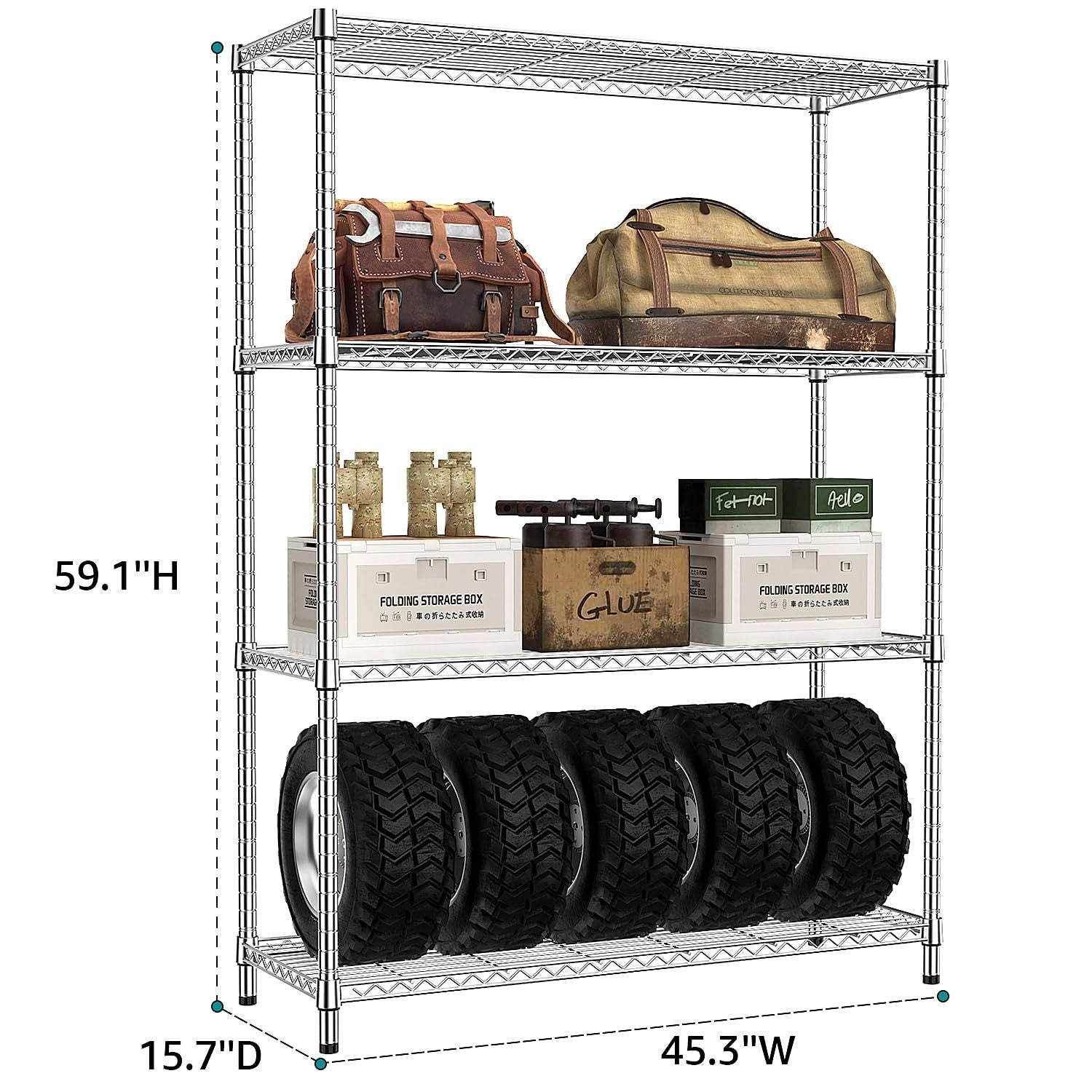 • 【Heavy Duty Capacity & Precise Dimensions】 Each shelf supports up to 350LB, with a total capacity of 1400LB. Dimensions: 15.8'D x 45.8'W x 59.4'H. Featuring 22.2mm diameter pipes, it provides a strong, stable structure ideal for storing heavy tools, equipment, and everyday items.