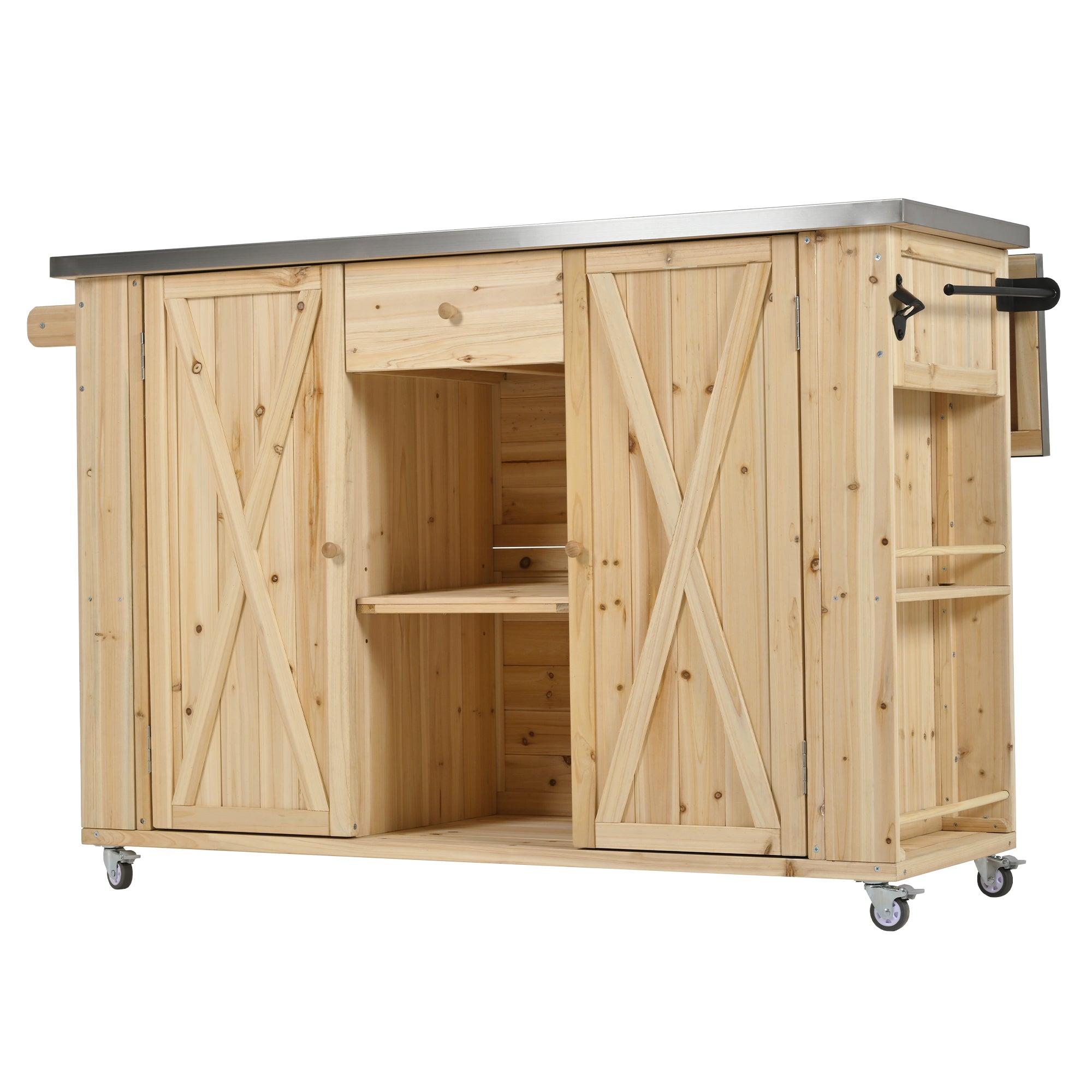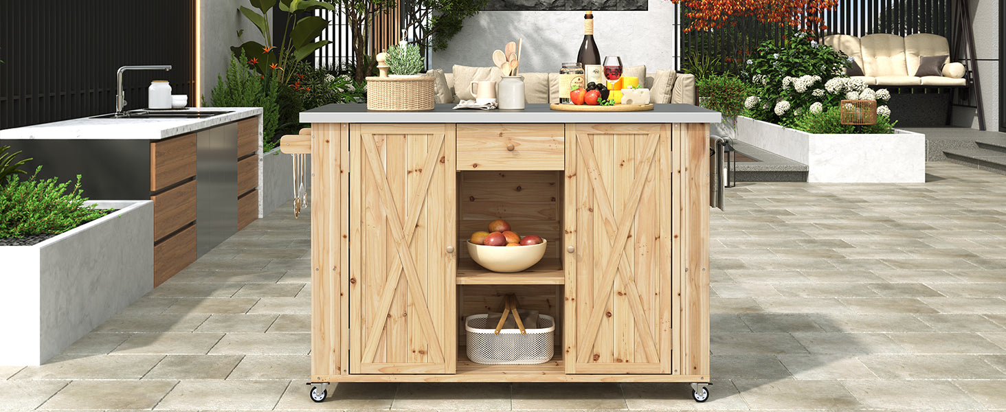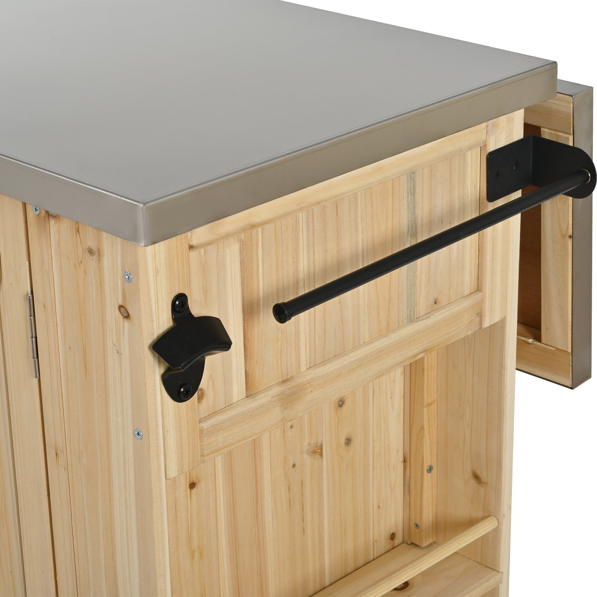 Outdoor Kitchen Island Fir Wood Kitchen Island with Stainless Steel Top, Ample Storage Space, Towel and Spice Racks and a Bottle Opener for Outdoor, Natural