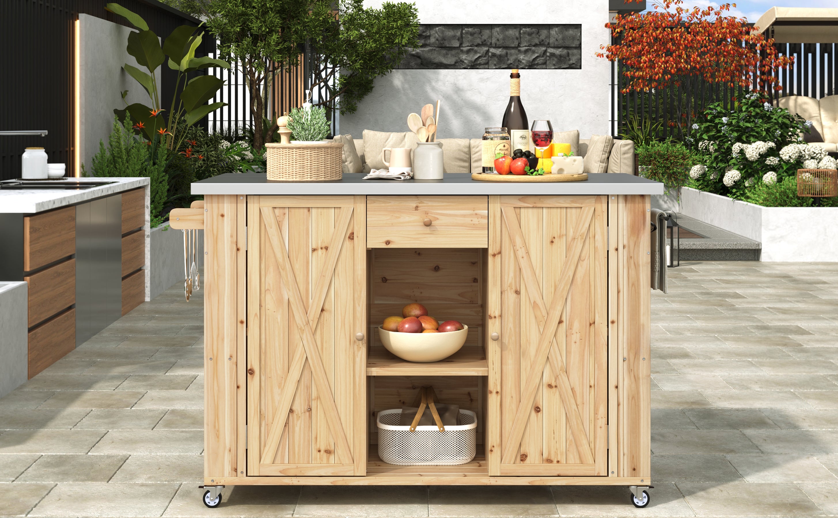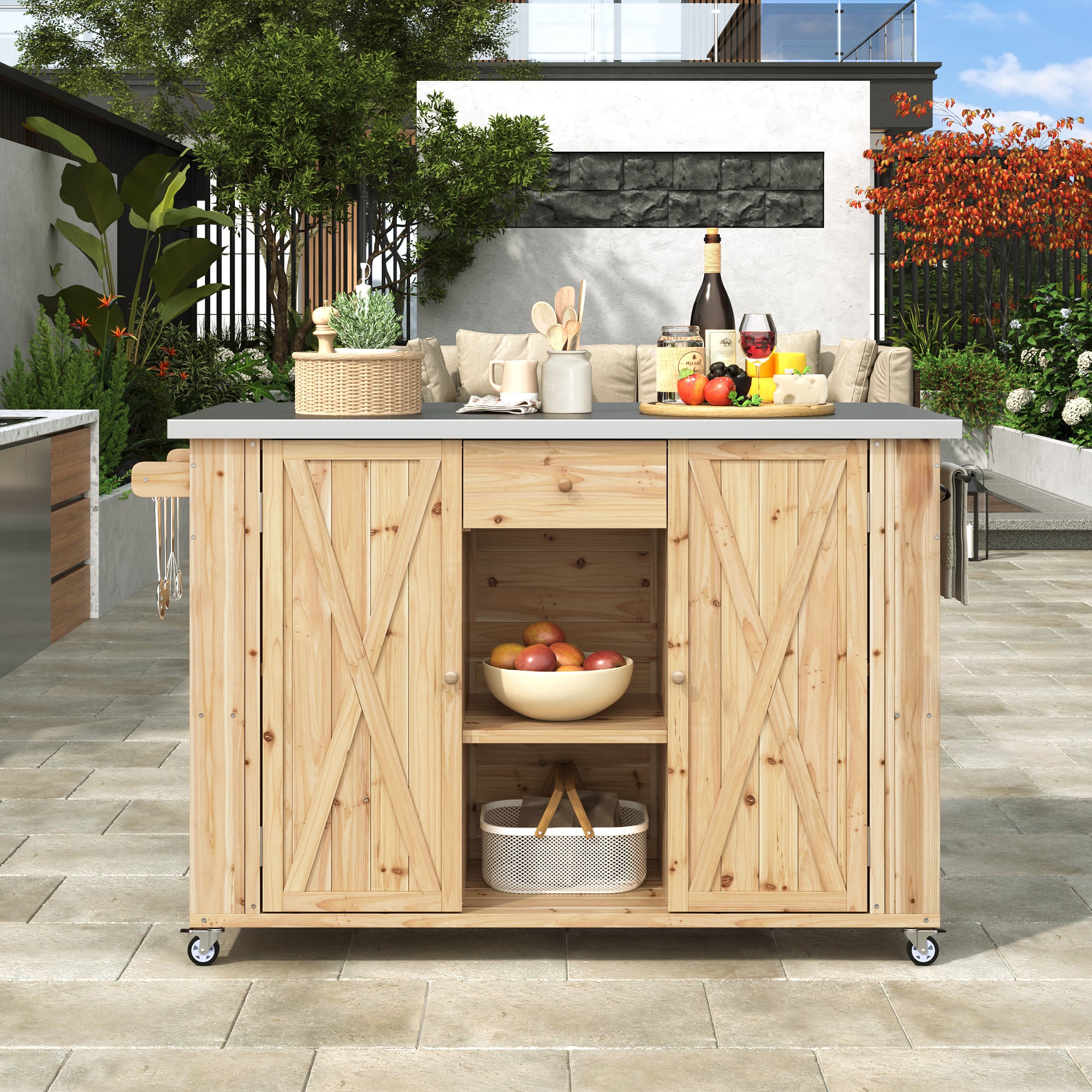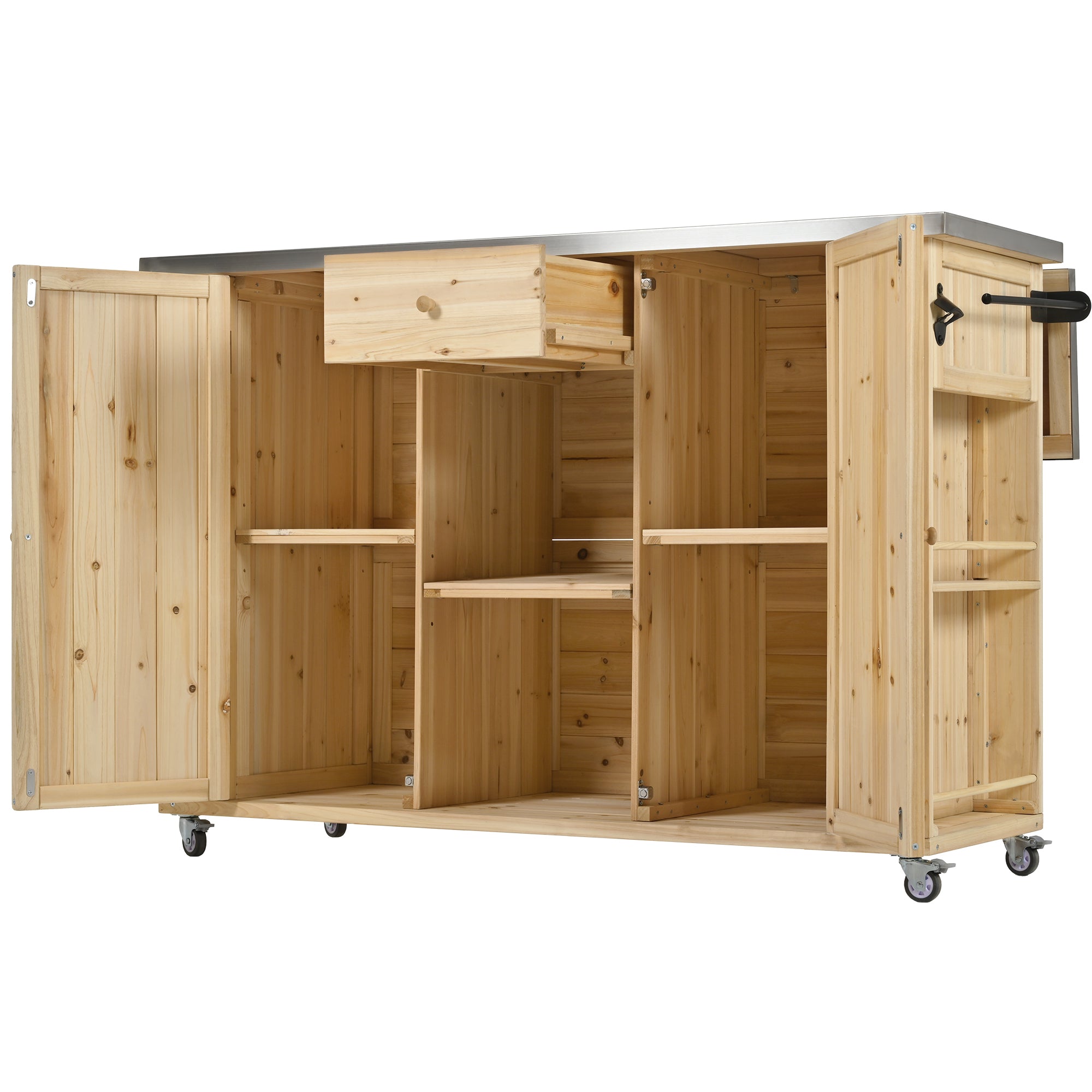 Outdoor Kitchen Island Fir Wood Kitchen Island with Stainless Steel Top, Ample Storage Space, Towel and Spice Racks and a Bottle Opener for Outdoor, Natural