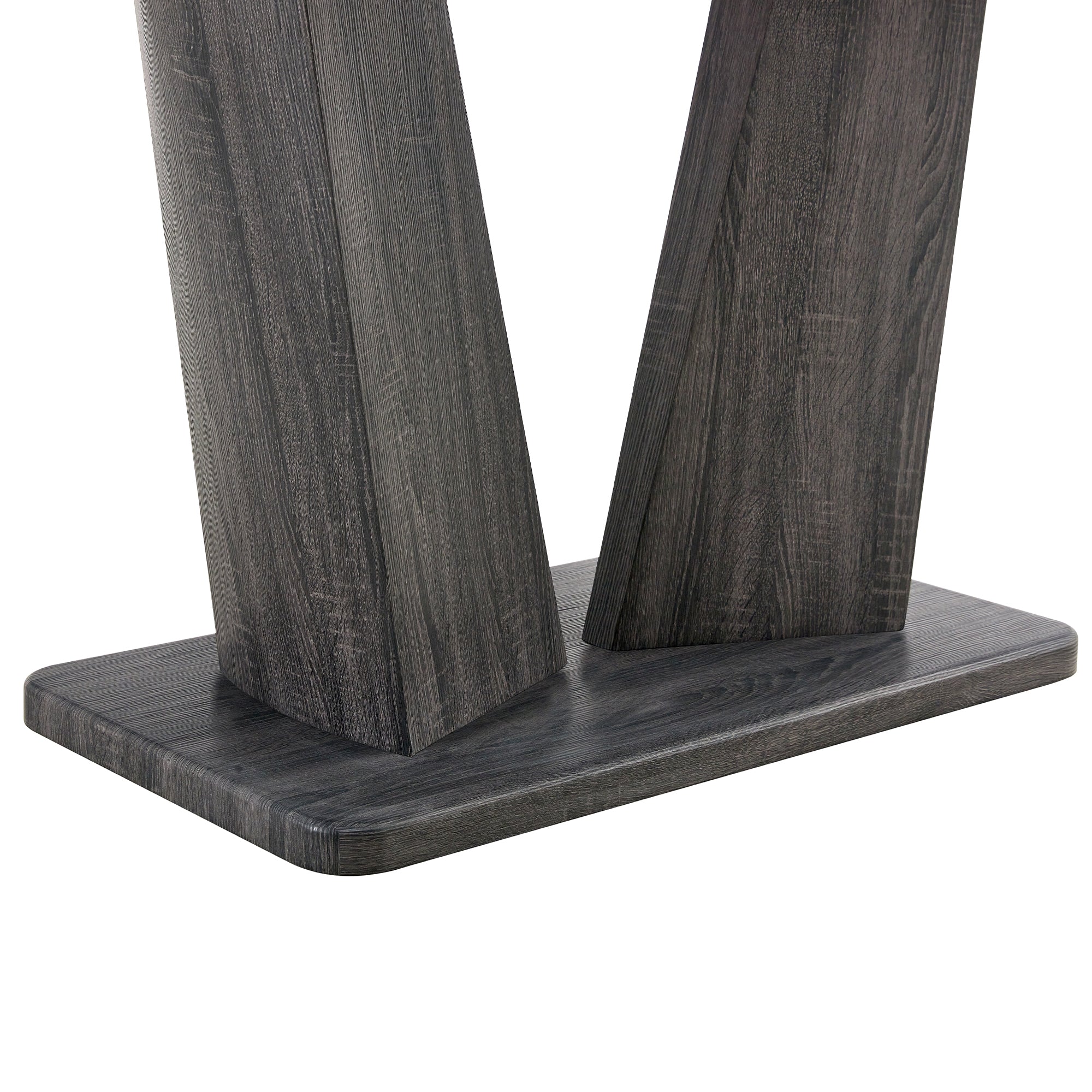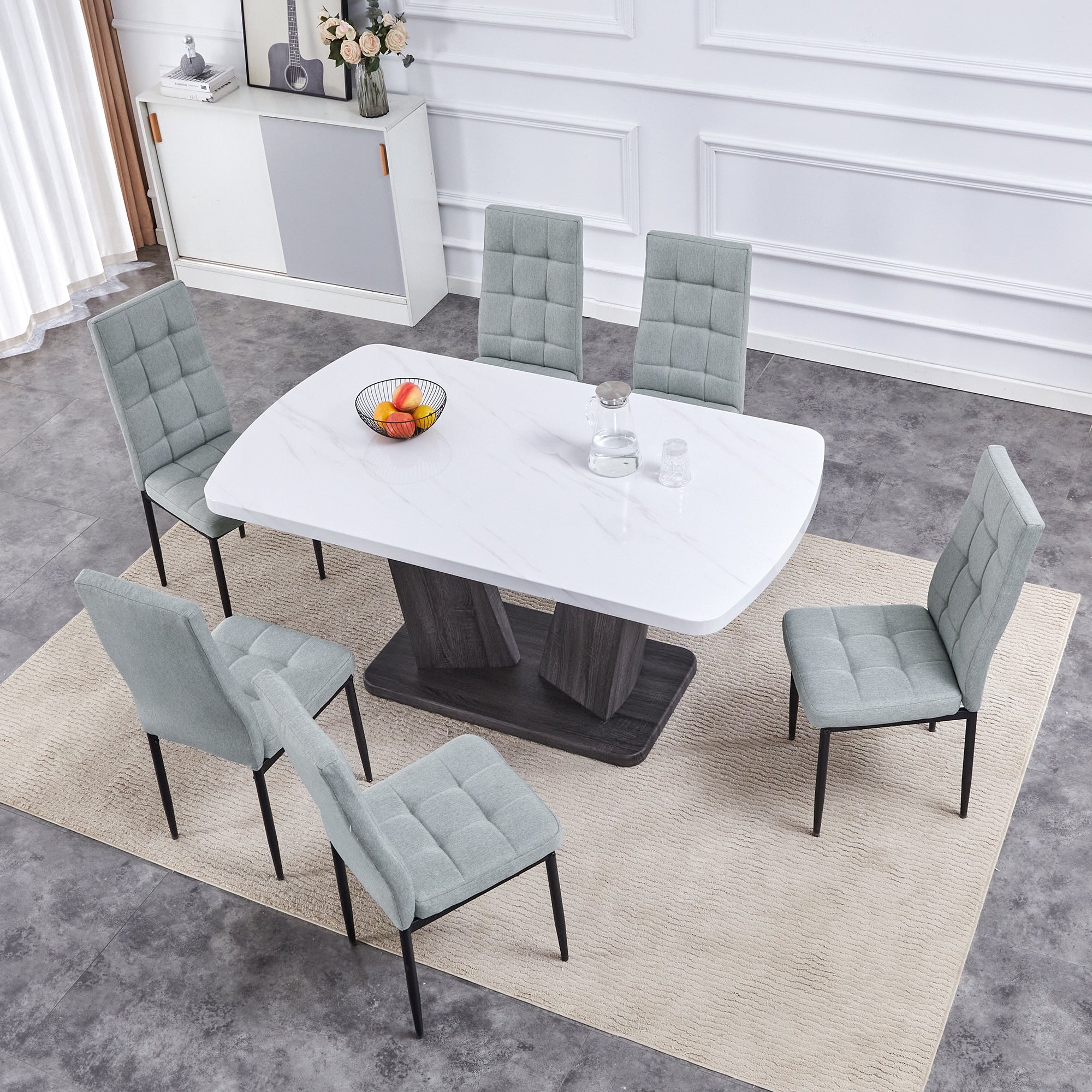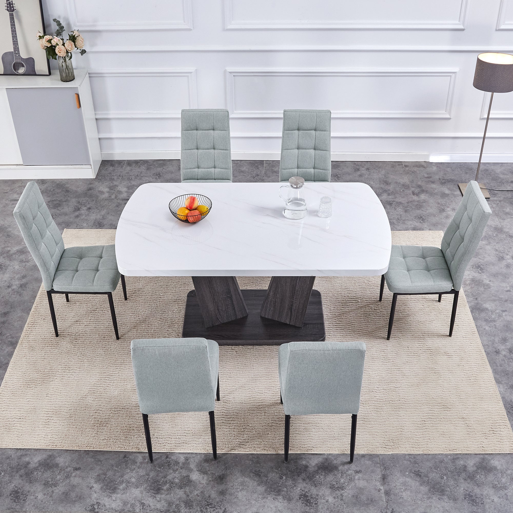 - Say goodbye to boring style. This 7-piece dining set has MDF and a stunning imitation marble tabletop and V-shaped table legs in a modern minimalist style. Simple, generous.