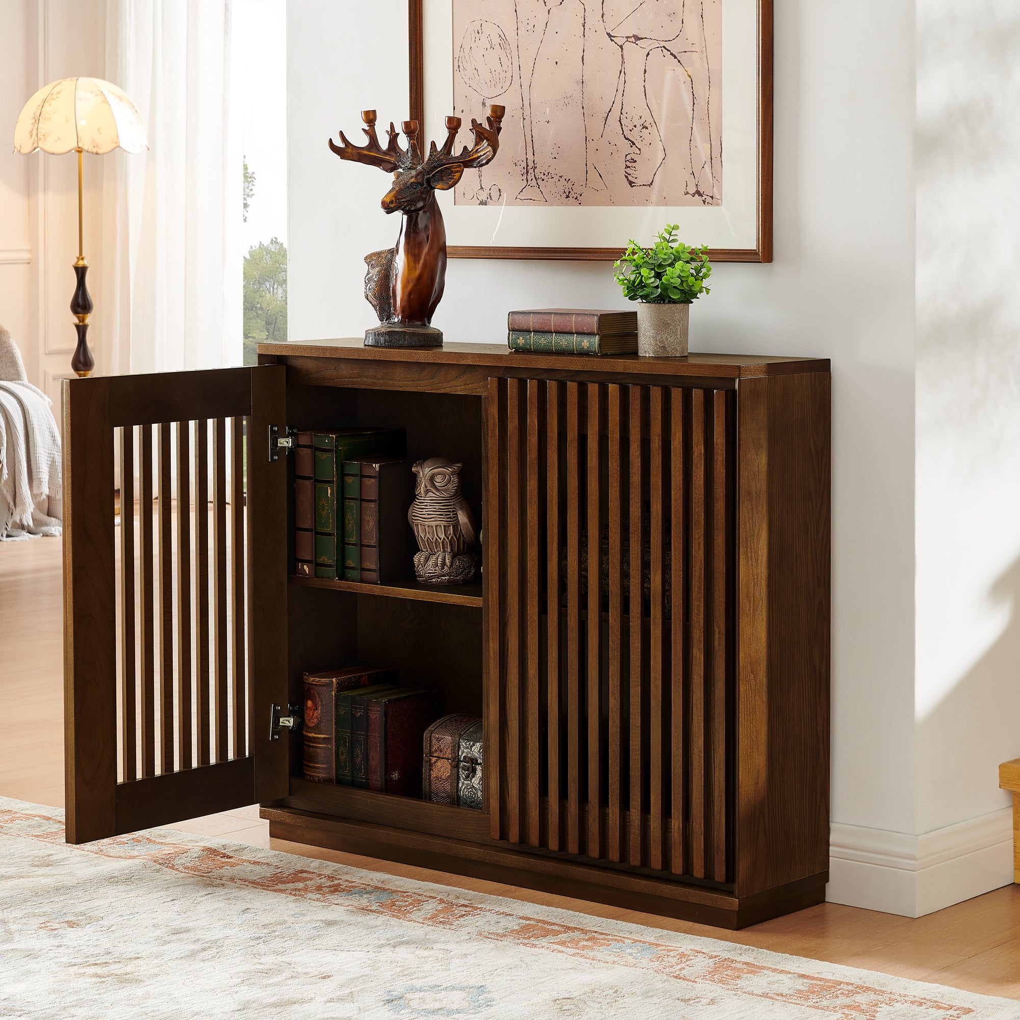 • [ Vintage Fluted Design ] - Elegant wood grain, vintage color and hollowed out solid wood strips are combined with the design to create a vintage and elegant appearance. Exquisite and elegant appearance and excellent storage function, can be flexibly used as hallway cabinet, entrance storage cabinet, file cabinet, dining cabinet, coffee bar cabinet, wine cabinet or living room decorative cabinet.