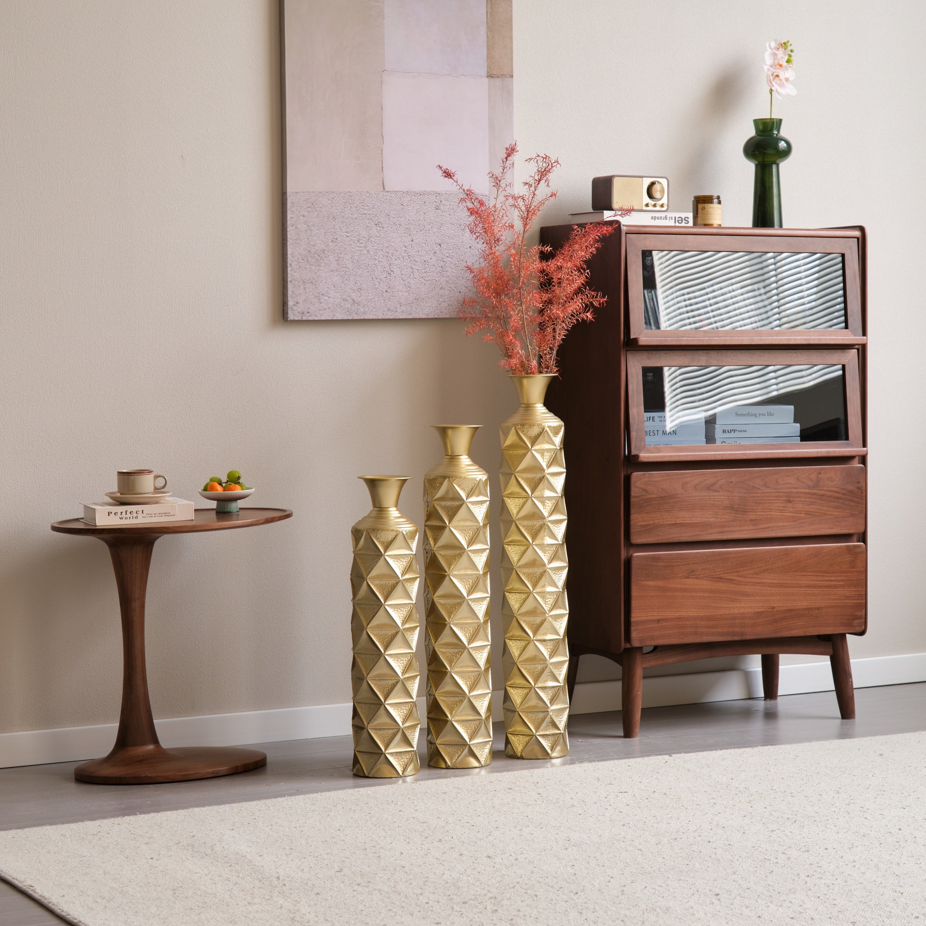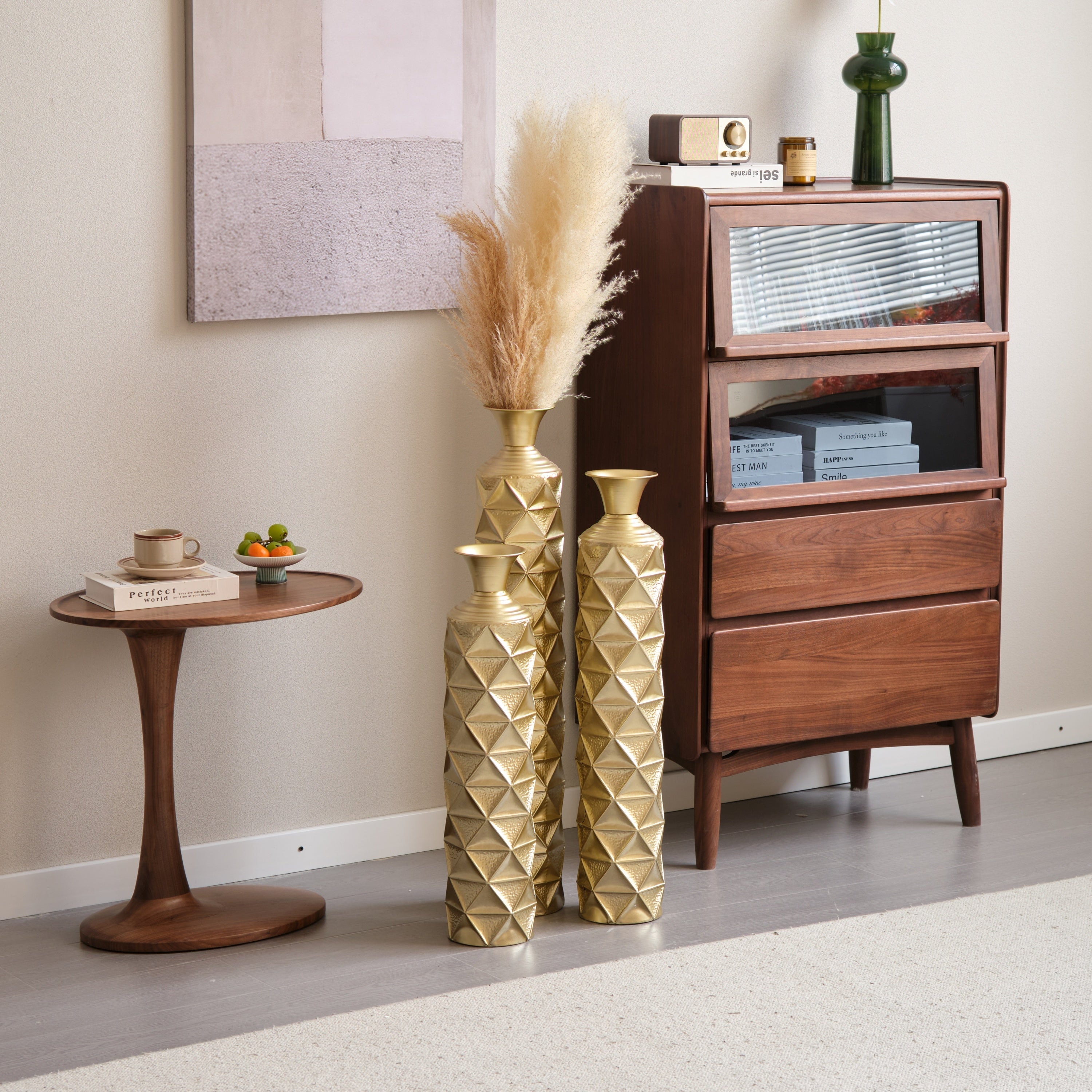 3-Piece GOLD Metal Decorative Floor Vase Set | High Distress Finish w/ 3D Triangle Pattern | Tall Centerpiece Vases for Home Decoration (33.5", 29.5", 25.2" High)