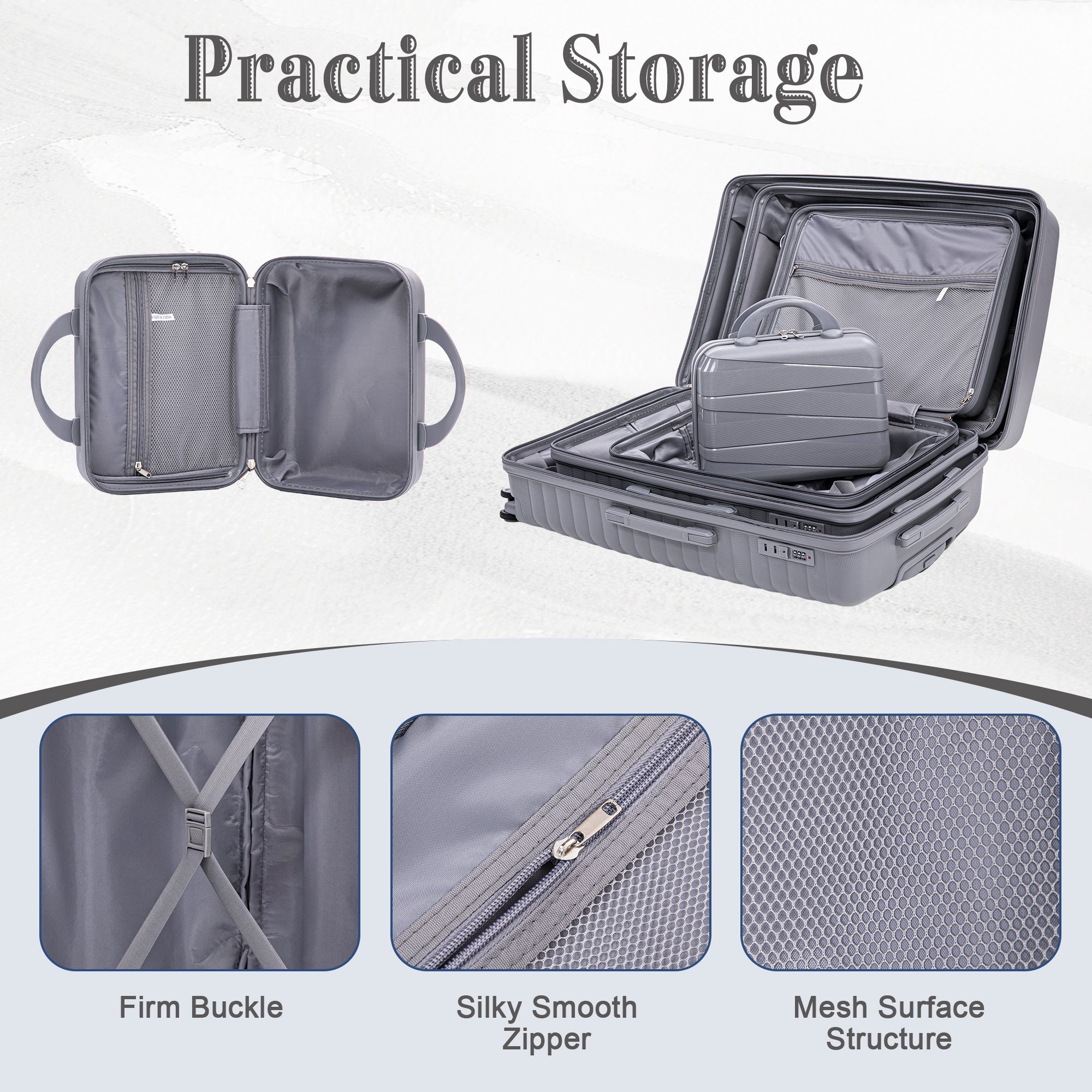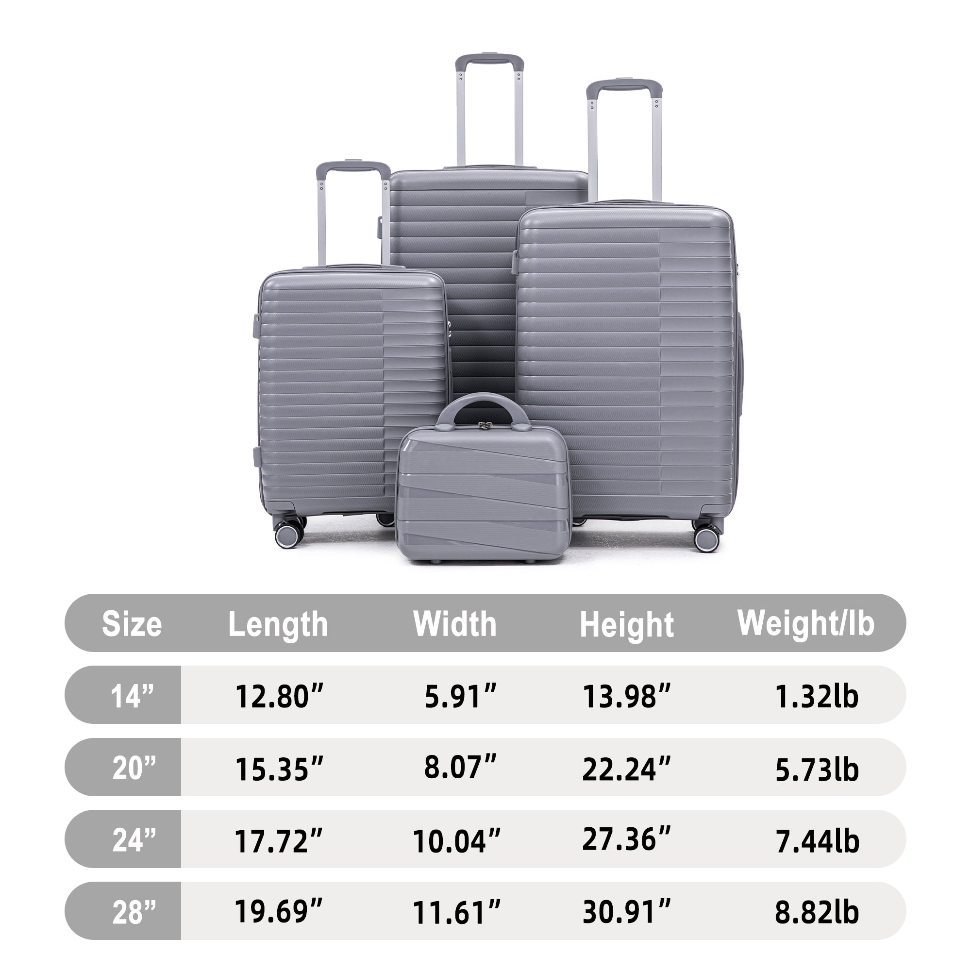 14'/20'/24'/28' 4 pcs/set in PP Spinner Wheel Luggage, Carry on Suitcase, Iron Pull Rod, Combination Password Lock, 14' Cosmetic Case (Light Gray)