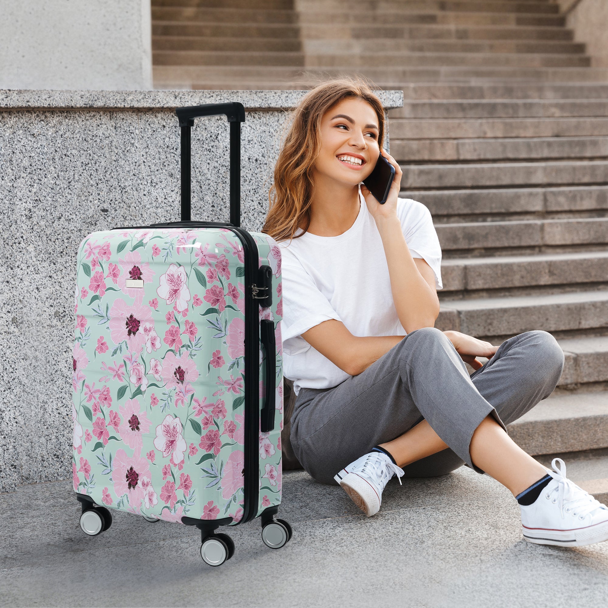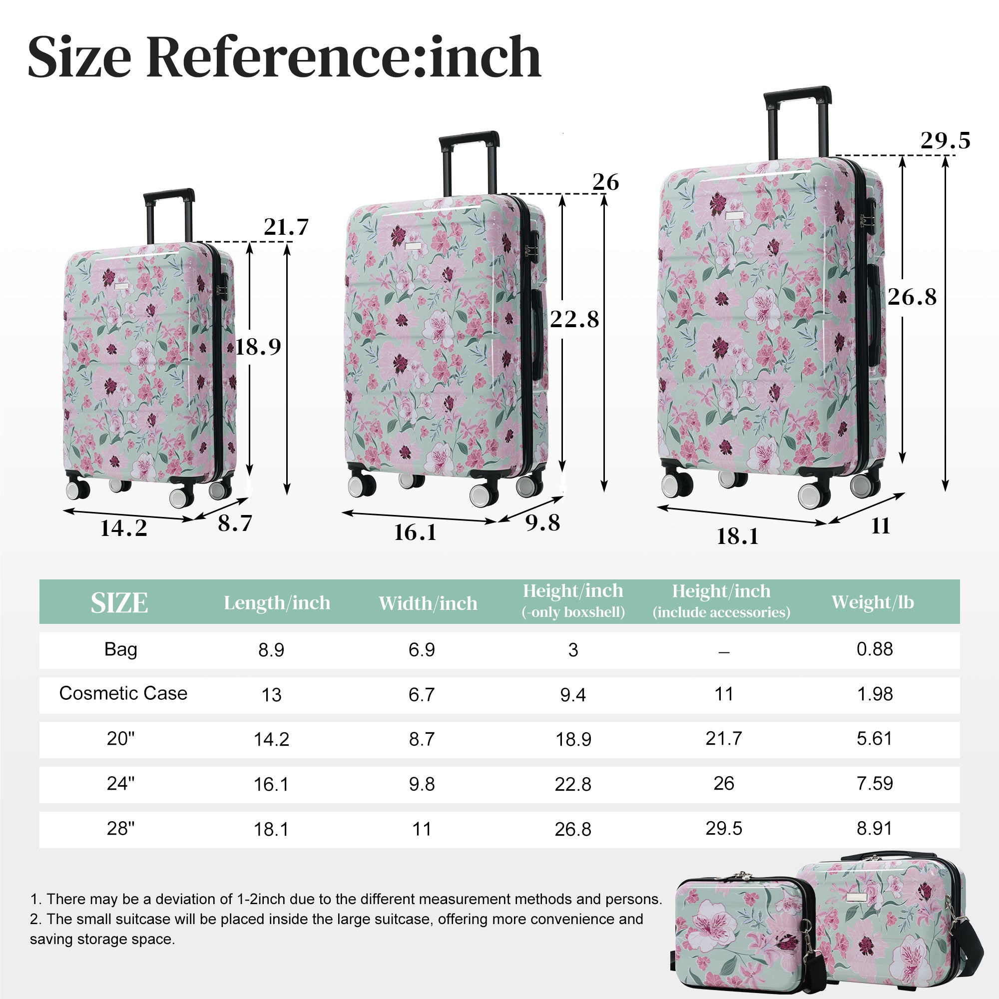 - The 5 pieces set includes 8' case, 14' cosmetic case and 20 inches, 24 inches 28 inches luggages. One set just satisfies all your different travelling needs.The printed suitcase is very summery and will turn you into a fashion expert in seconds.