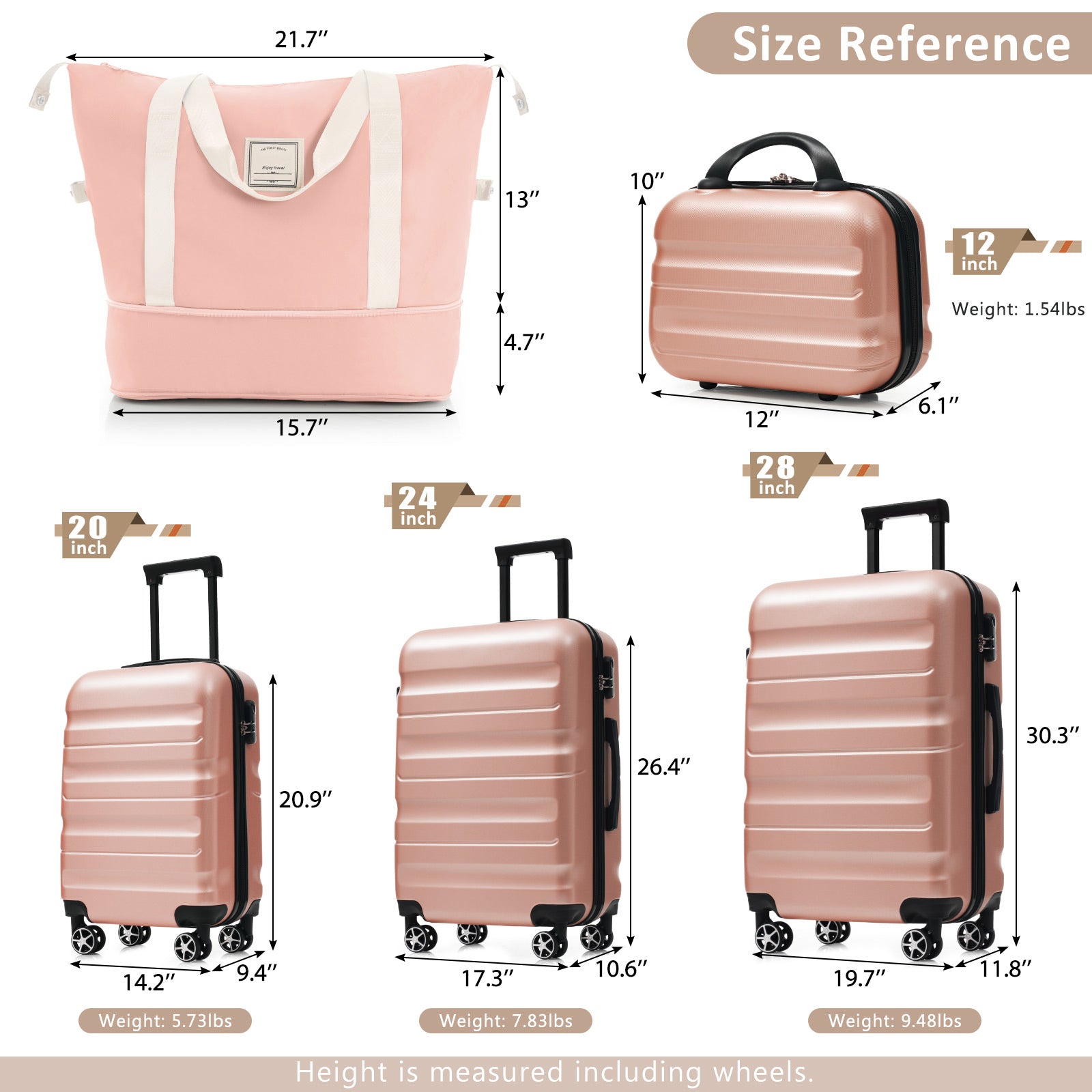 • Size Reference: 12-inch travel case 12 x 6.1 x 10', 1.54 lbs. 20-inch carry-on 14.2 x 9.4 x 20.9', 5.73 lbs. 24-inch luggage 17.3 x 10.6 x 26.4', 7.83 lbs. 28-inch luggage 19.7 x 11.8 x 30.3', 9.48 lbs. The suitcases can be nested inside each other to save storage space.