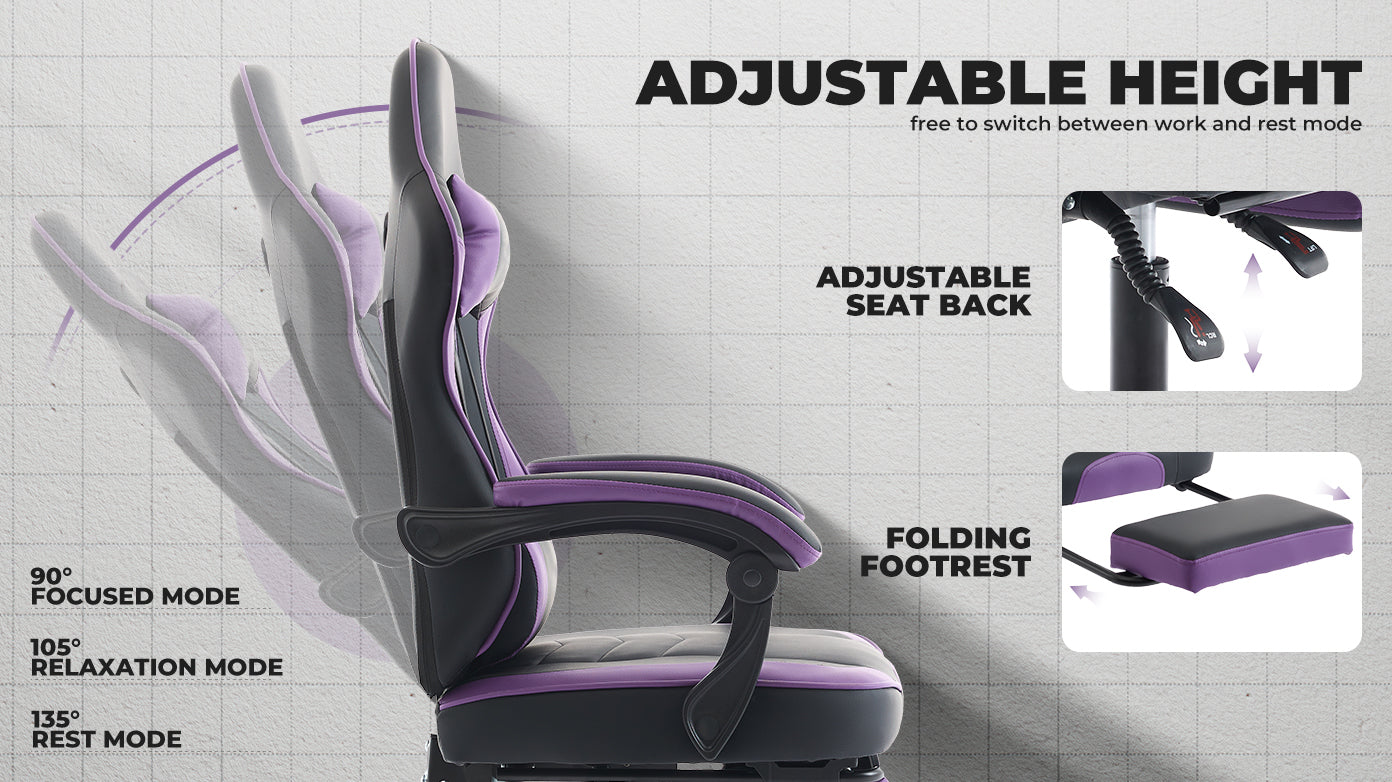 • Versatile And Adjustable: The gaming chair includes an adjustable headrest, a seat height adjustment range of up to 4 inches, and retractable foot supports to meet the needs of users of different heights. The back of the chair can be adjusted to 90°, 105°, and 135°, so you can find the ideal Angle for work, play, or relaxation. The chair also has silent wheels to make the movement smoother and quieter for the best comfort experience