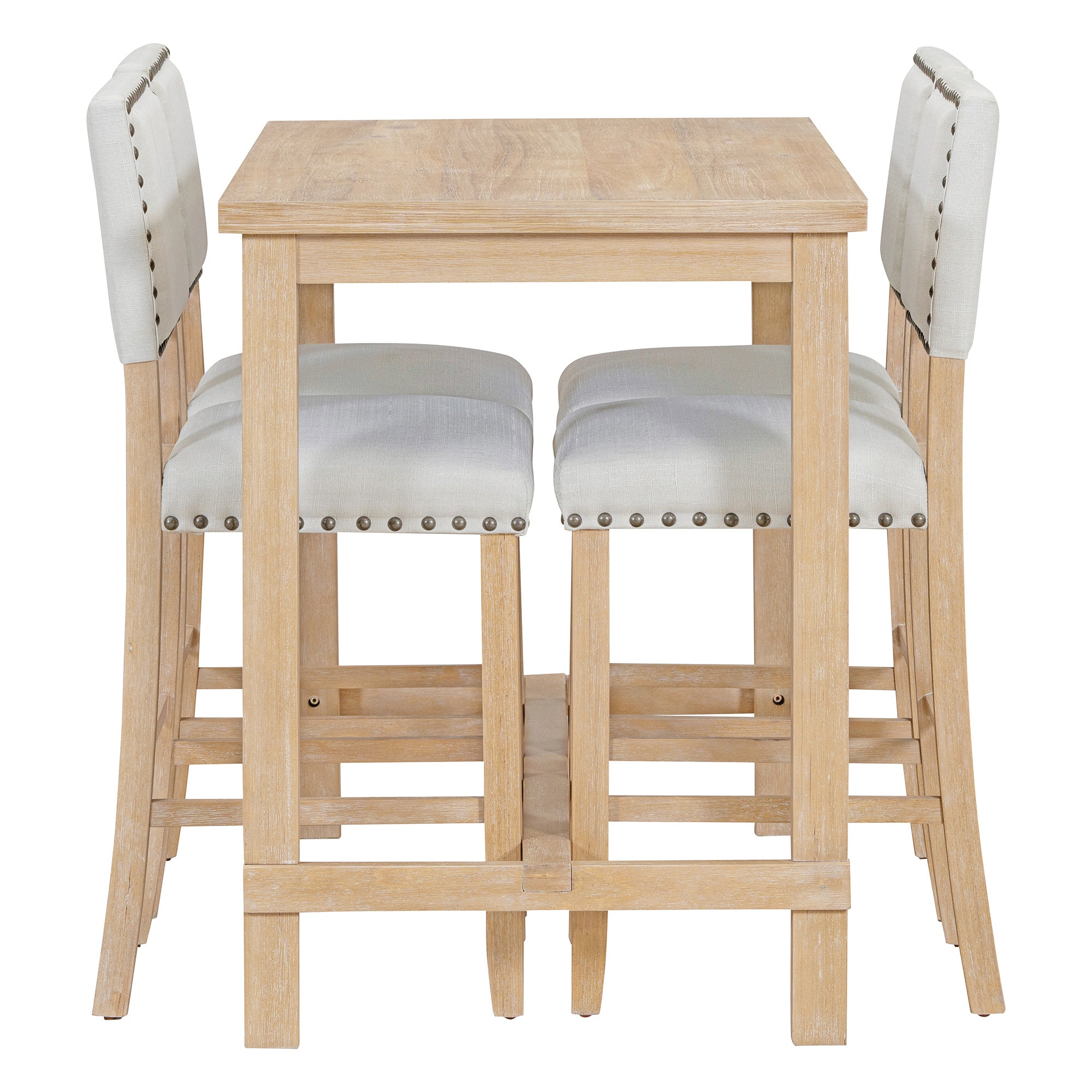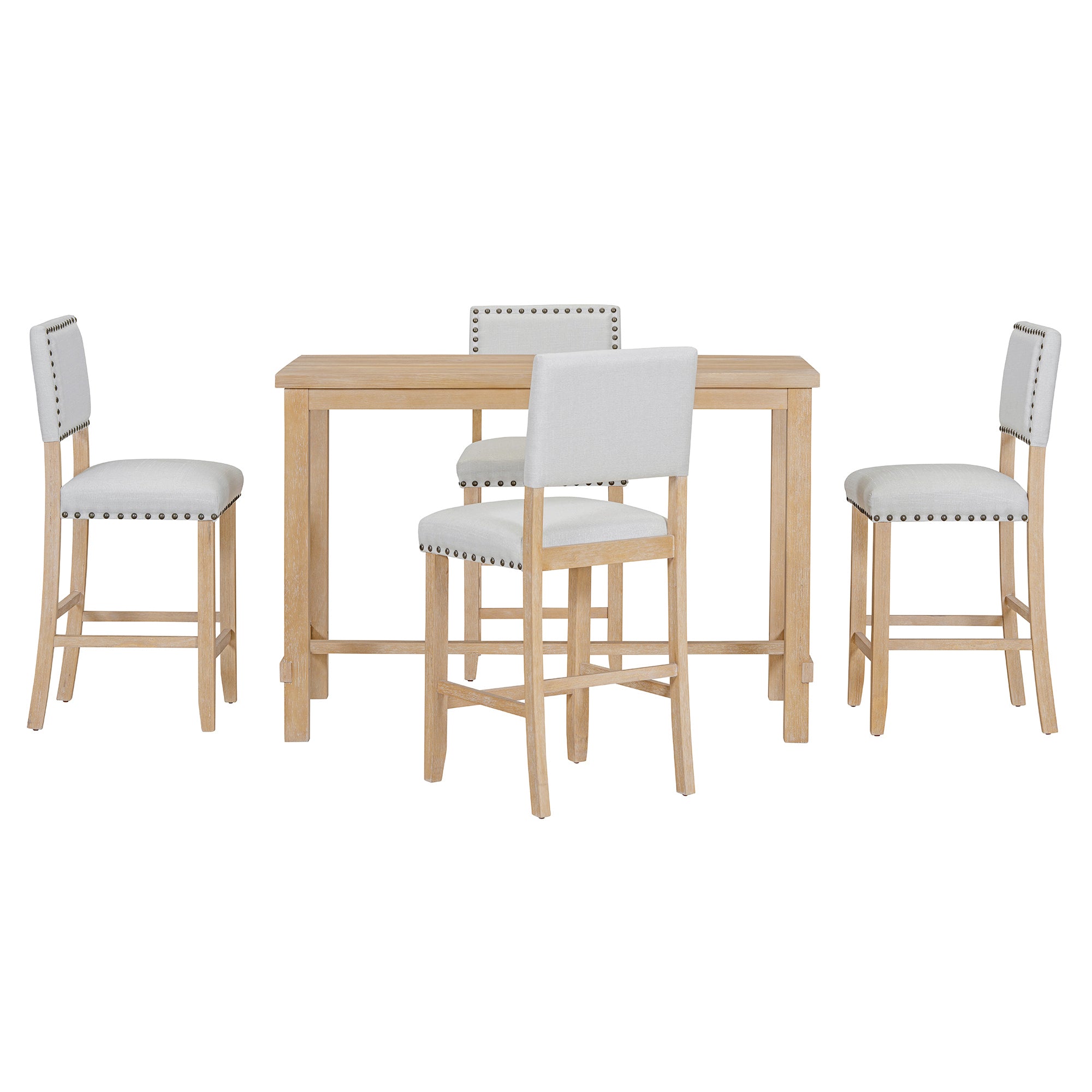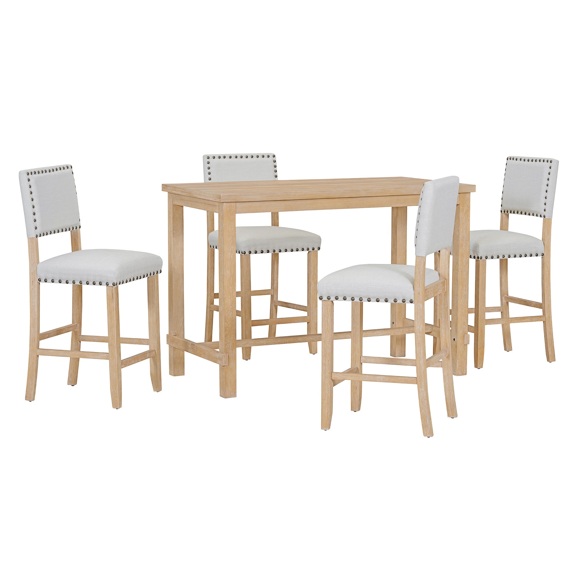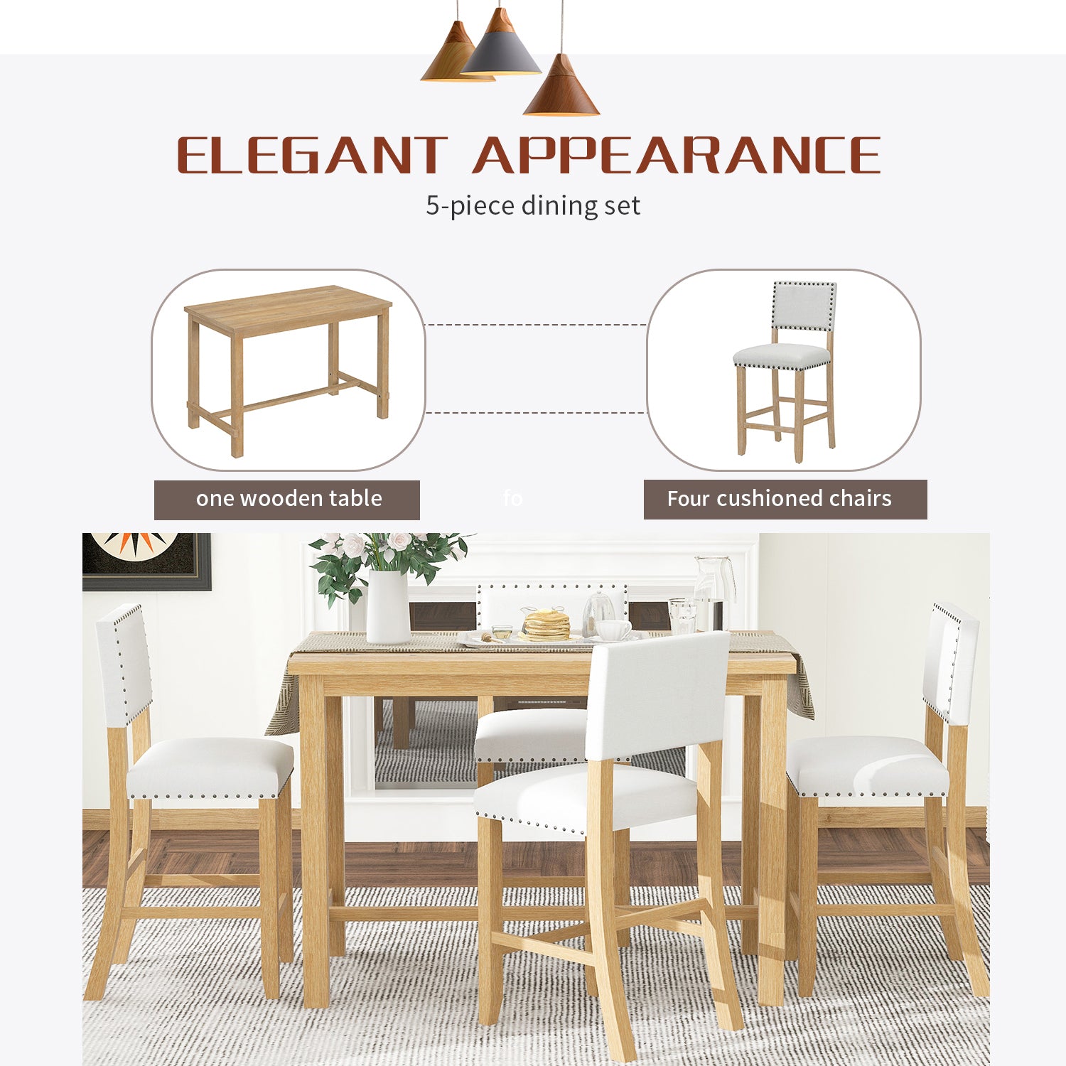 - Elegant Appearance: Add an air of elegance to your space with this classy 5-piece dining set including one wooden counter height table and four cushioned chairs with nail head trim in an eye-catching and contemporary natural wood wash and beige color scheme. Table Dimensions: 52"L x 27"W x 36.3"H. Chair Dimensions: 18"L x 19"W x 40.5"H.