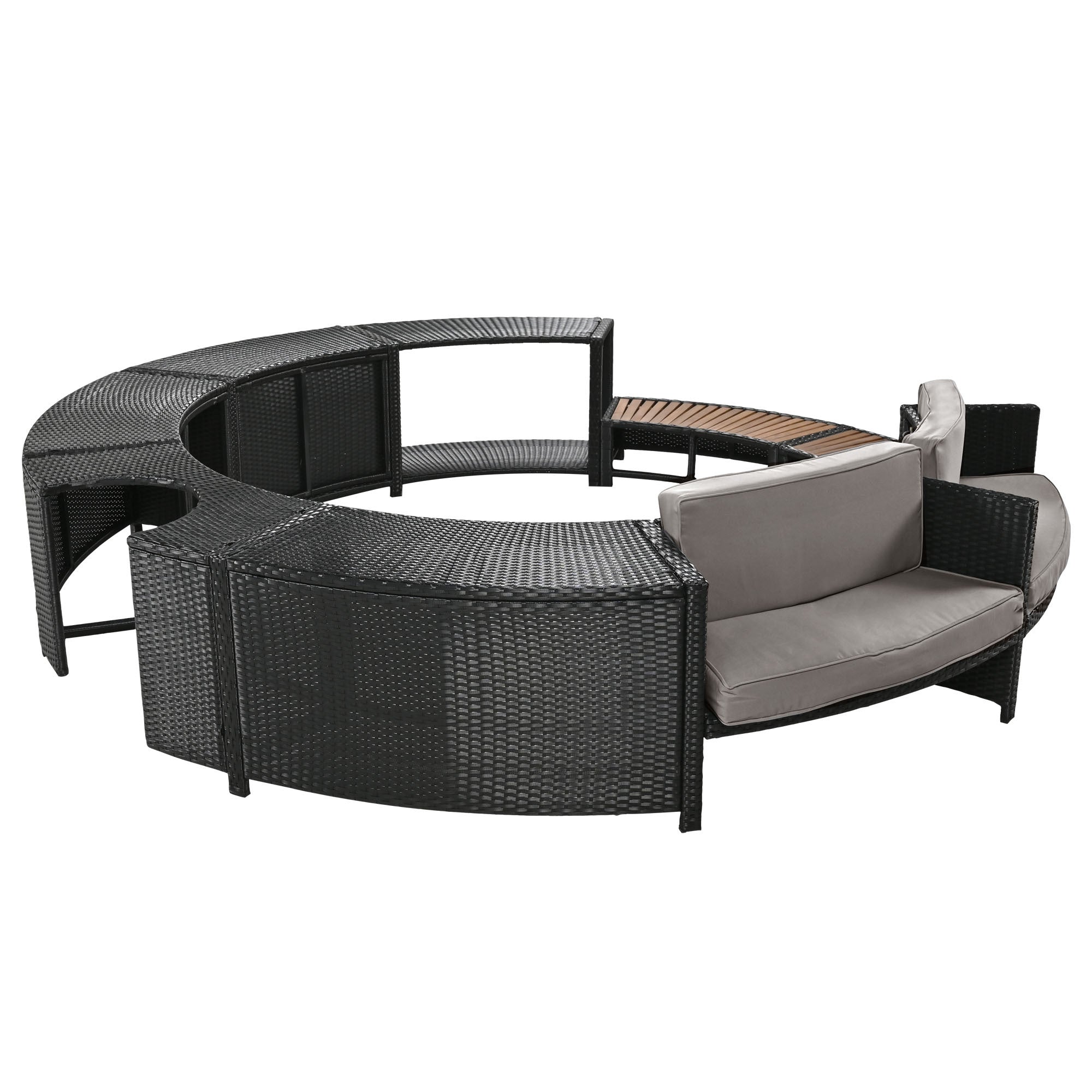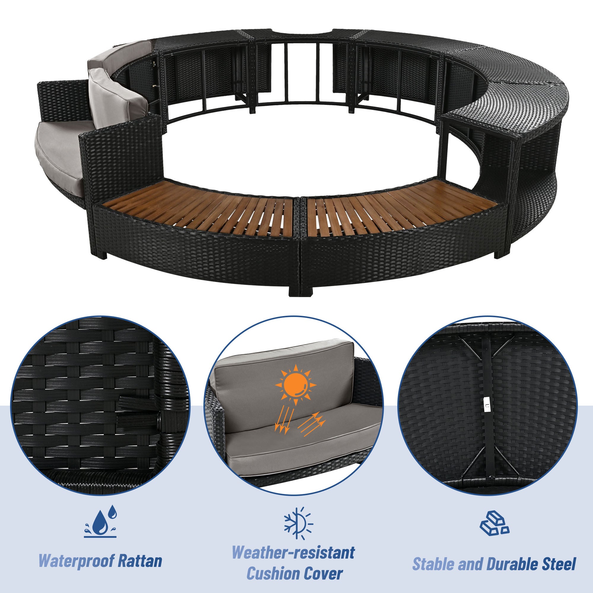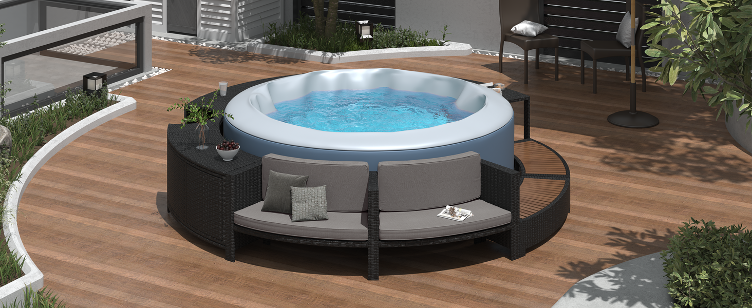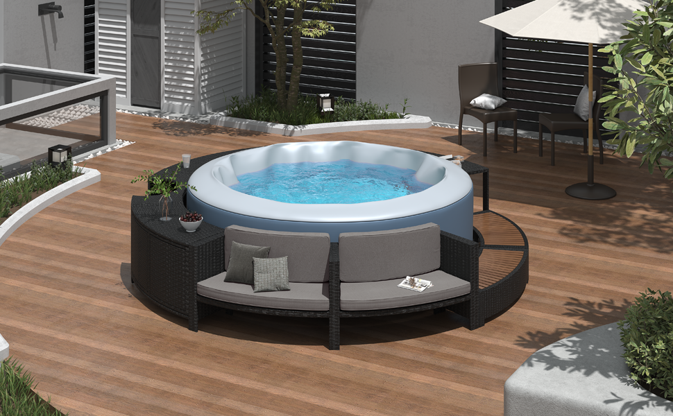 Crafted from weather-resistant grey PE rattan and supported by a sturdy steel frame, this multifunctional seating solution adds comfort, organization, and modern style to any patio, backyard, or poolside area. Whether you're entertaining or relaxing after a soak, this stylish spa surround creates the ultimate outdoor lounge experience.