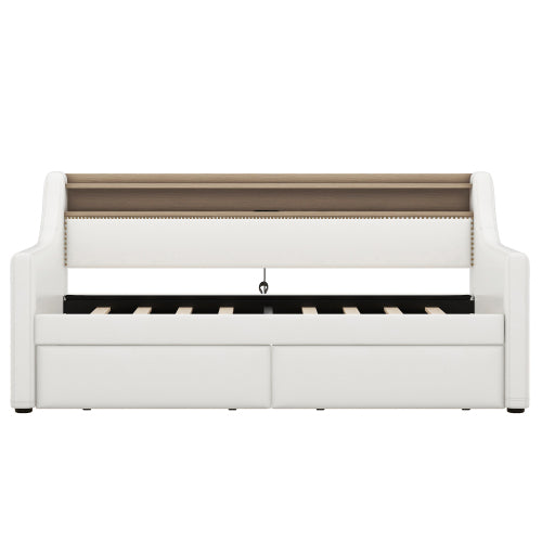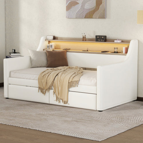 Twin Size Daybed with Drawers, Upholstered Daybed with Charging Station and LED Lights, White(Old Item W1580S00021)